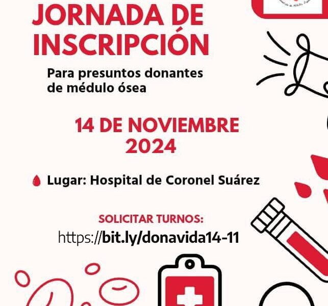 Solicita turno a través del formulario web: https://bit.ly/donavida14-11 El próximo 14 de noviembre de 2024 te esperamos desde las 7:00 hasta las 14:00 para donar sangre y, a su vez, verificar tu compatibilidad para donación de médula ósea. El Municipio de Coronel Suárez junto a la ONG Más Vida en Vida y con el apoyo de personal especializado del Centro