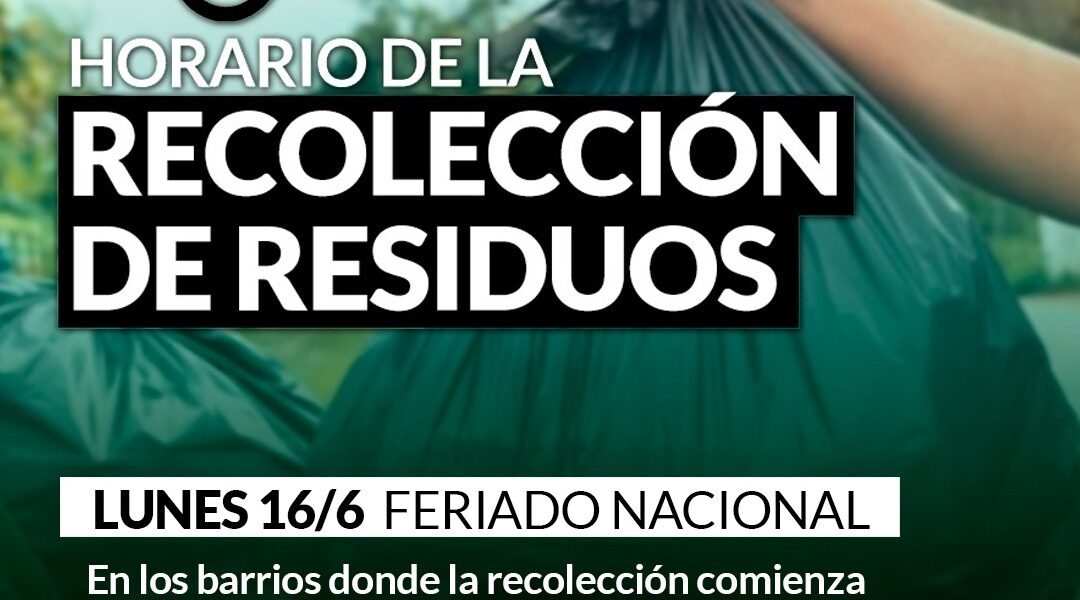 La secretaria de Servicios Públicos informa a la comunidad que este lunes 16 de junio día en que se conmemora el Paso a la Inmortalidad del General Don Martin Miguel de Güemes -feriado nancional- el Servicio de recolección de residuos domiciliarios se prestará de la siguiente manera: El recorrido de las 15:00hs pasará a las 05:00hs. El recorrido de las