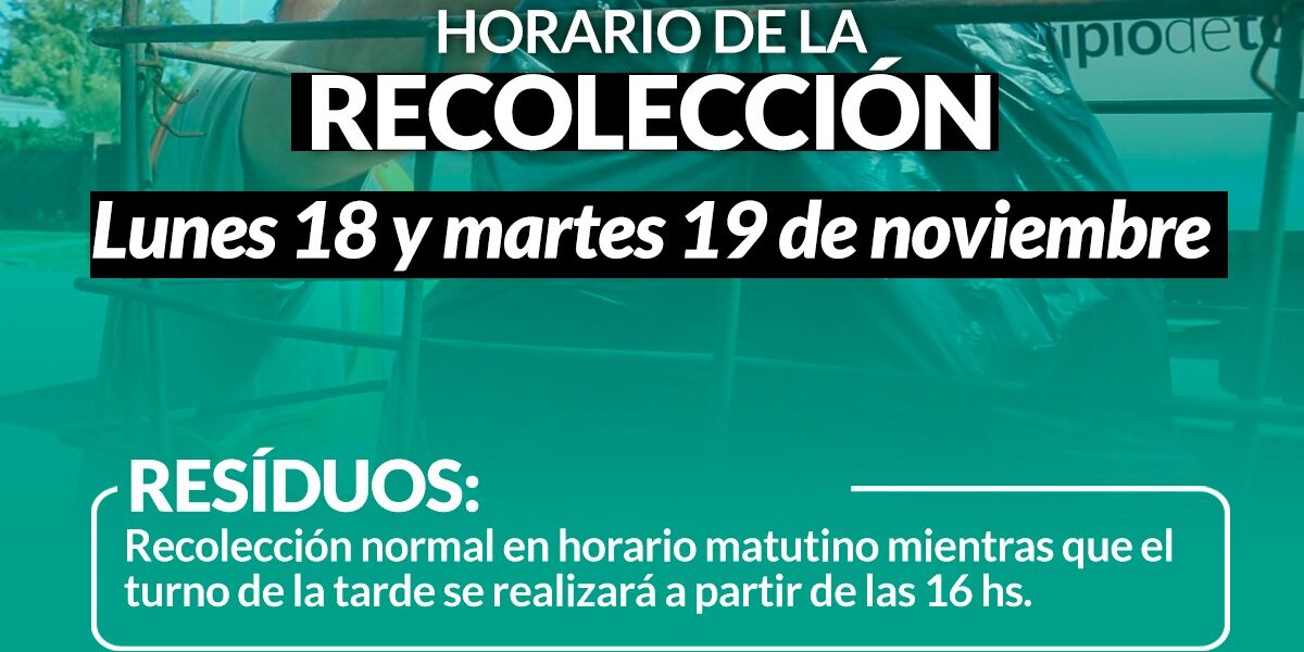 La secretaría de Servicios Públicos informa a la población que el próximo lunes 18 de noviembre, feriado trasladable por el Día de la Soberanía Nacional y martes 19, asueto por el Día del Trabajador Municipal; la recolección de residuos será normal en horario matutino, mientras que por la tarde se realizará a partir de las 16.