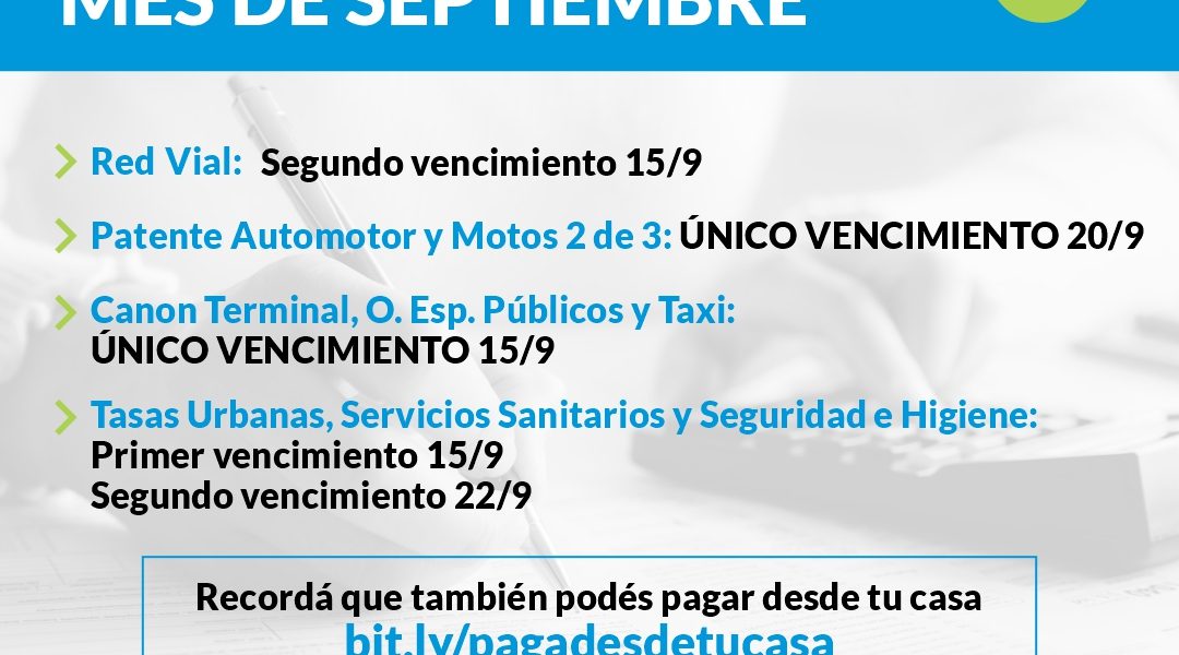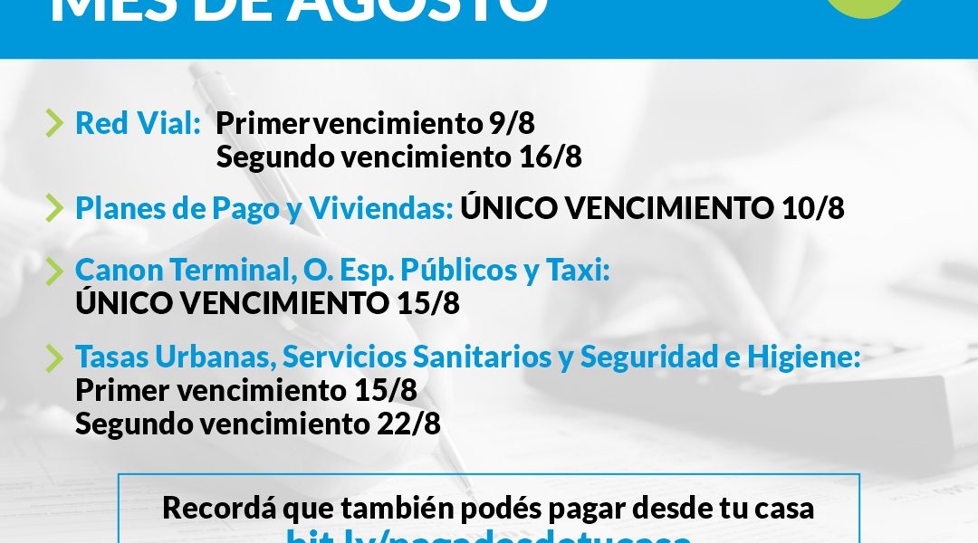 Las cajas de TESORERÍA de la Municipalidad atienden en el horario de 7.00 a 13.00. Desde nuestra web podrán pagar la misma en forma on line con todas las formas de pago (Tarjeta de Débito, Tarjeta de Crédito, Billetera Virtual (Cuenta DNI, Modo, Mercado Pago, E Pago) Recordamos nuestros medios digitales donde consultar y abonar en línea cualquier tasa,