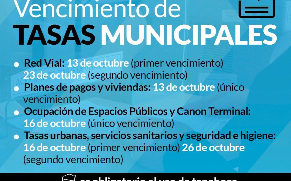 Las cajas de TESORERÍA de la Municipalidad atienden en el horario de 7.30 a 13.00 con prioridad para adultos mayores, respetando las medidas sanitarias, el uso obligatorio de mascarillas comunitarias y el distanciamiento social?. ⠀ Planes de pagos y viviendas: 10 de noviembre. Único vencimiento. Ocupación de Espacios Públicos y Canon Terminal: 16 de noviembre. Único vencimiento. Tasas urbanas,