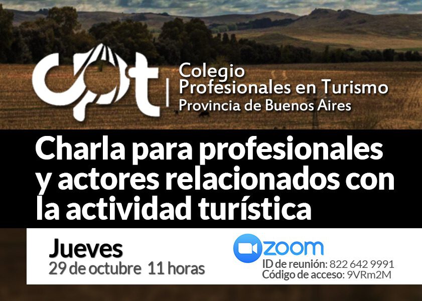 ?♂️Destinada para profesionales y actores relacionados con la actividad turística. Jueves 29 de octubre a las 11 a través de la plataforma virtual ZOOM. Para más información comunicarse a dirturismomcs@gmail.com ✍La subdirección de Turismo invita a profesionales y actores relacionados con la actividad turística a una charla a cargo del Colegio de Profesionales en Turismo de la Provincia de Buenos