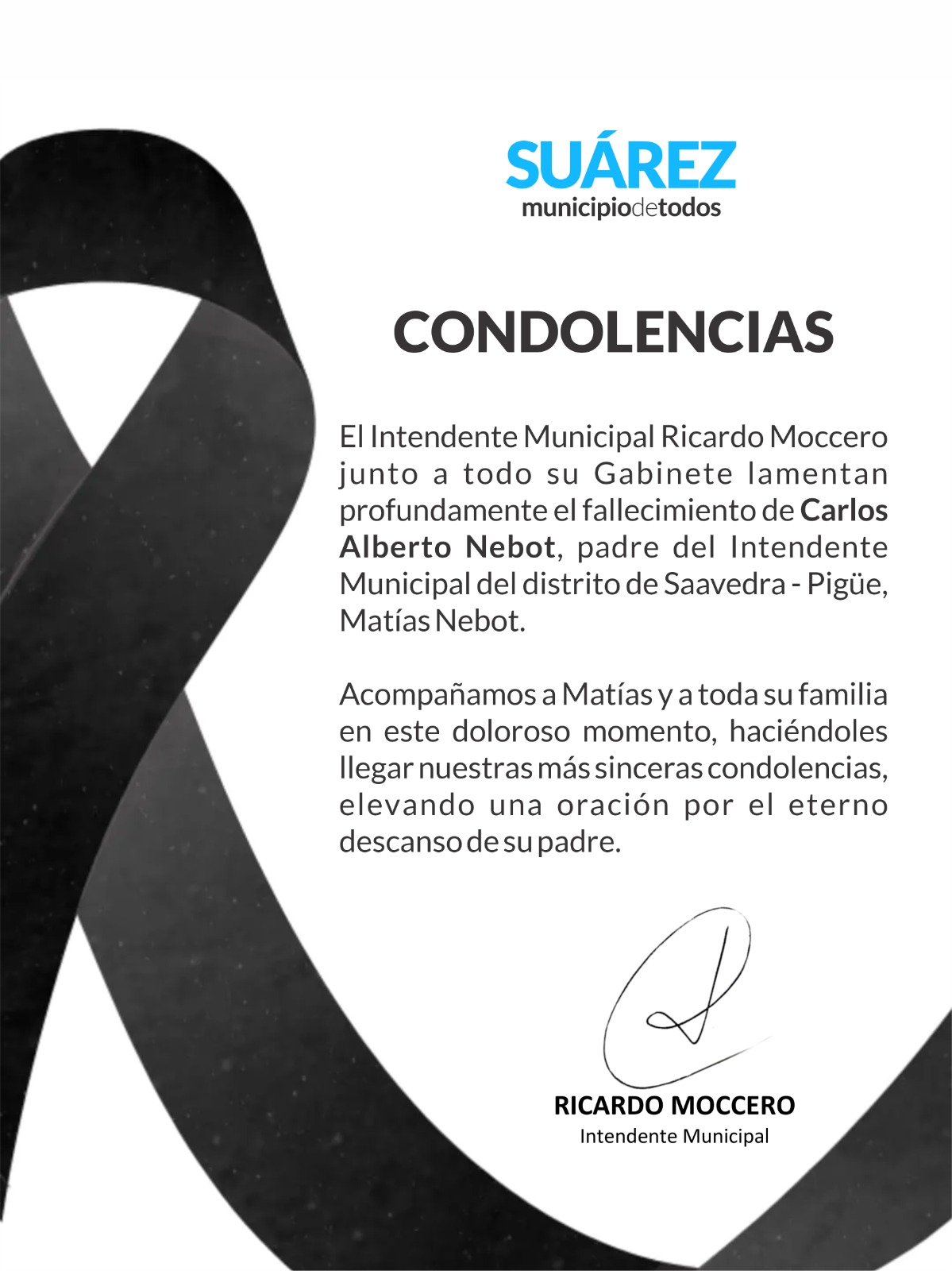 El Intendente Municipal Ricardo Moccero junto a todo su Gabinete lamentan profundamente el fallecimiento de Carlos Alberto Nebot, padre del Intendente Municipal del distrito de Saavedra-Pigüé, Matías Nebot.