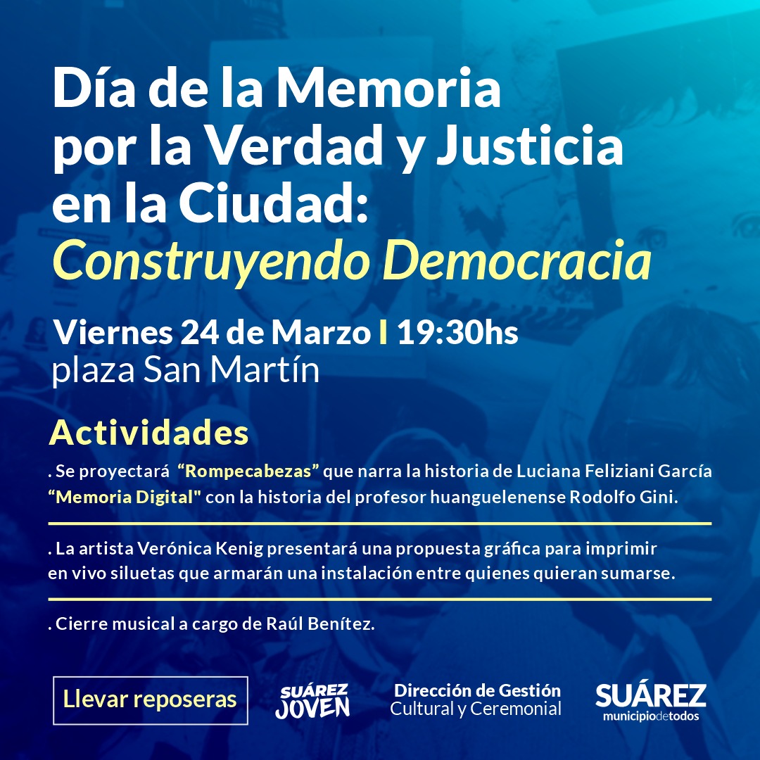 Con el objetivo de convocar a la memoria, valorar los 40 años de democracia y reafirmar nuestro compromiso con el respeto y promoción de los derechos humanos, el viernes 24 de marzo nos encontramos a las 19:30 en la plaza San Martin de Coronel Suárez. Se realizarán espacio de reflexión, proyección de videos, propuestas participativas y un cierre musical a cargo de Raúl Benítez. Llevar reposeras.