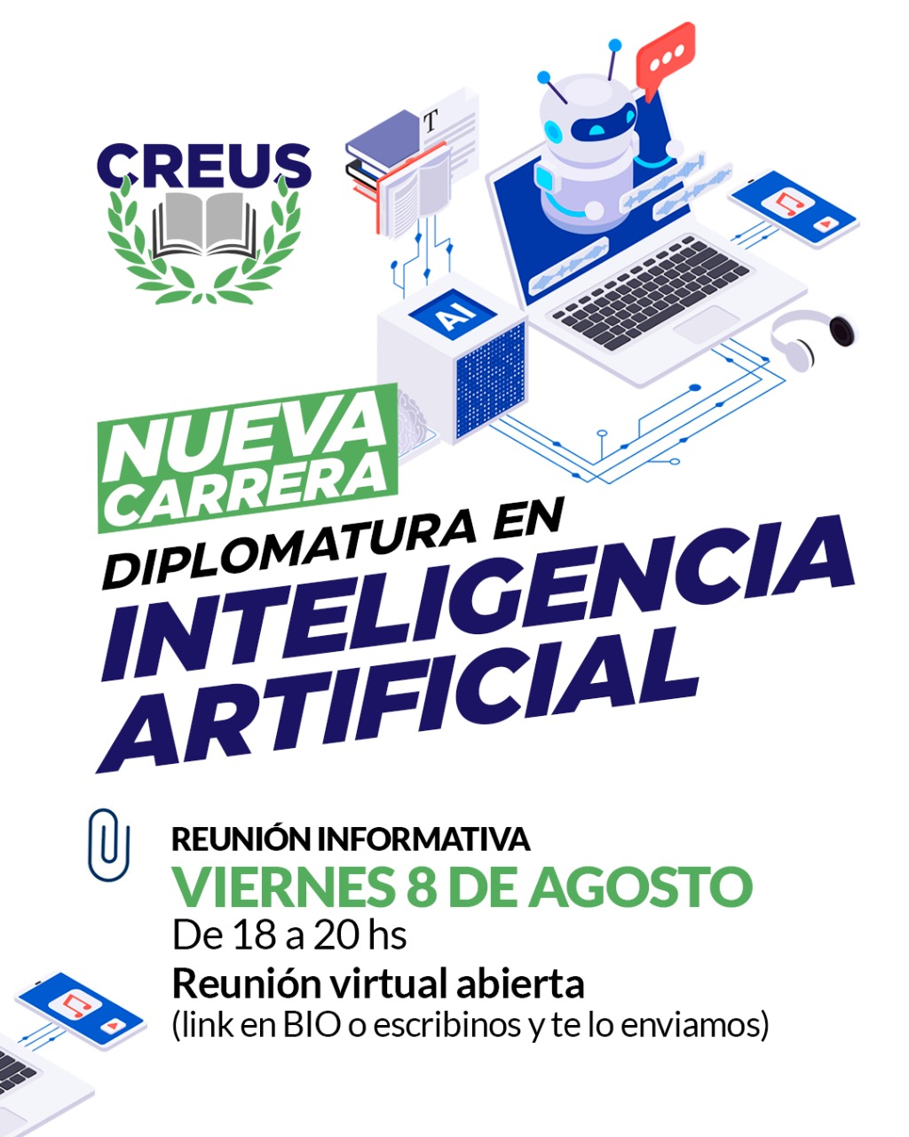 Este viernes 8 de agosto de 18 a 20 hs, se realizará una reunión virtual abierta a toda la comunidad para quienes estén interesados en conocer más sobre la Diplomatura en IA.