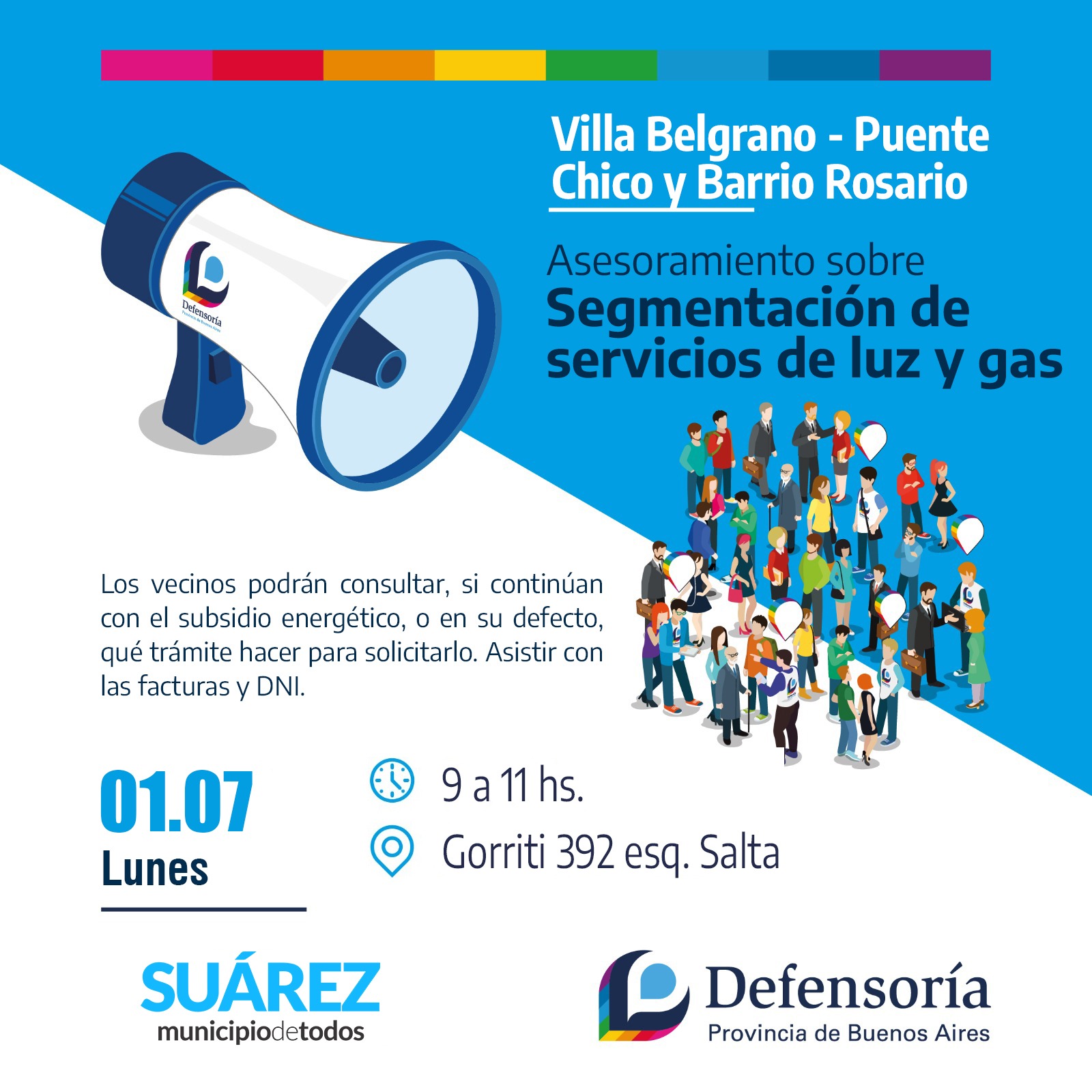 La subsecretarรญa de Desarrollo Social del Municipio de Coronel Suarez junto a la Defensorรญa del Pueblo a cargo de la doctora Bรกrbara Carcedo invitan a la comunidad de barrio Villa Belgrano, Rosario y Puente Chico para asesorarse sobre la segmentaciรณn de los servicios de luz y gas, que se realizarรก el lunes 1ยฐ de julio de 9 a 11 en la sede del programa Enviรณn.