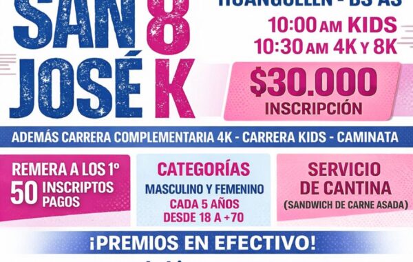 Huanguelén Domingo 3 de mayo 10:00 hs KIDS 10:30 hs 4K y 8K Inscripción: $30.000 Además: carrera 4K, carrera kids y caminata Remera para los primeros ...