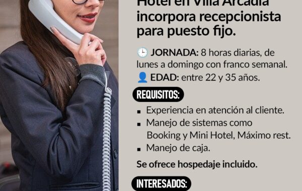Hotel en Villa Arcadia incorpora recepcionista para puesto fijo. Jornada: 8 horas diarias, de lunes a domingo con franco semanal. Edad: entre 22 y 35 ...