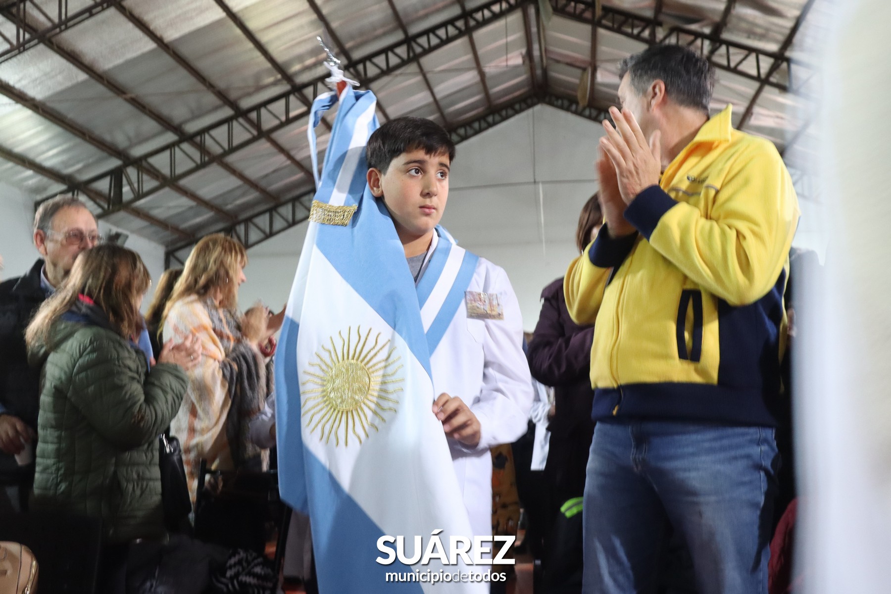 Durante el acto, la Inspectora de Enseñanza de Nivel Primario Miriam Benítez entonó las estrofas del Himno Nacional Argentino junto a jóvenes de la Escuela Secundaria N° 6 de la localidad de Dufaur del distrito de Saavedra, que acompañaron con lenguaje de señas.