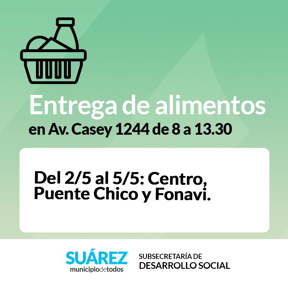 La subsecretaría de Desarrollo Social informa a las familias asistidas que continúa la entrega de alimentos secos correspondiente al mes de MAYO, en Avenida Casey 1244, de 8 a 13:30.