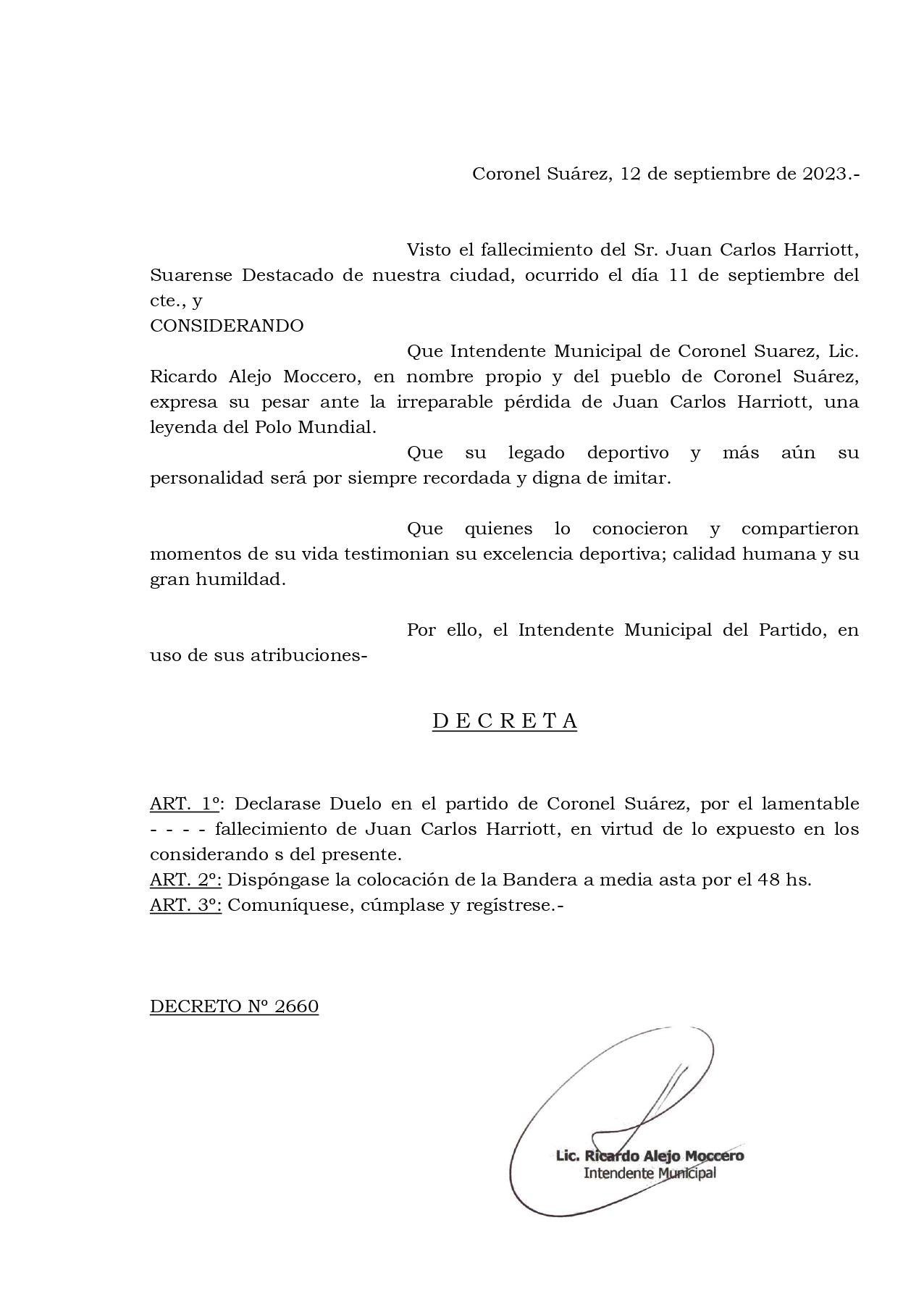 El Intendente Municipal Ricardo Moccero decretó duelo en el partido de Coronel Suárez por el lamentable fallecimiento de Juan Carlos Harriott.