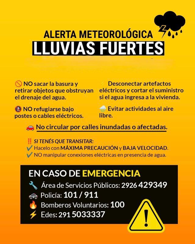 El área será afectada por lluvias y tormentas fuertes, algunas localmente severas. Las mismas estarán acompañadas principalmente por precipitaciones abundante en cortos períodos.