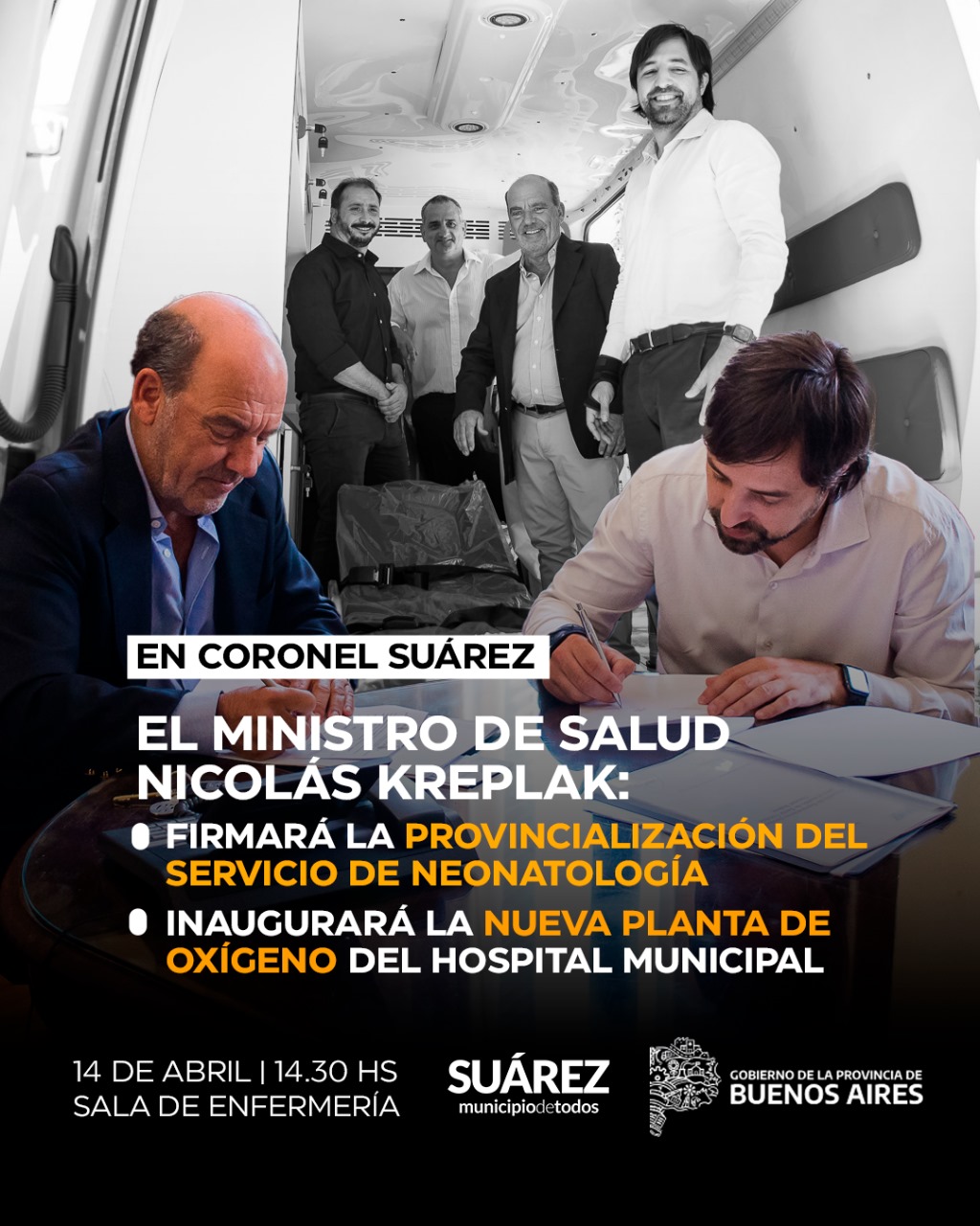 Por decisión del Gobernador Axel Kicillof y las gestiones del Intendente Ricardo Moccero, el Ministro de Salud de la Provincia de Buenos Aires, Dr. Nicolás Kreplak, visitará Coronel Suárez el próximo lunes 14 de abril a las 14.30 hs, en un acto que tendrá lugar en la sala de Enfermería del Hospital Municipal “Dr. Raúl Caccavo”.
