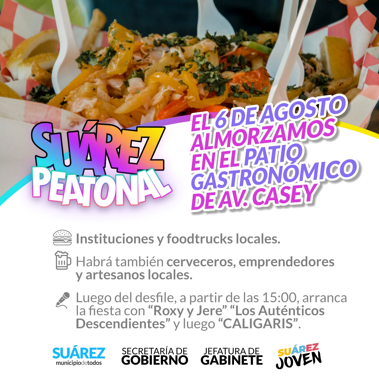 En lo que será “la fiesta” de todos los suarenses, el 6 de agosto nos preparamos para disfrutar de #SuarezPeatonal sobre avenida Casey, invitando a los vecinos a disfrutar del almuerzo con las diversas propuestas gastronómicas que ofrecerán los clubes e instituciones de Suárez y los Pueblos Alemanes.