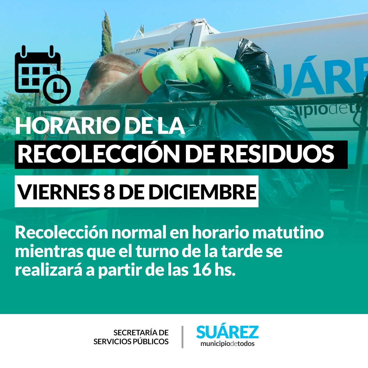La secretaría de Servicios Públicos informa a la población que mañana viernes 8 de diciembre feriado por el Día de la Inmaculada Concepción de María, la recolección de residuos será normal en horario matutino, mientras que por la tarde se realizará a partir de las 16.