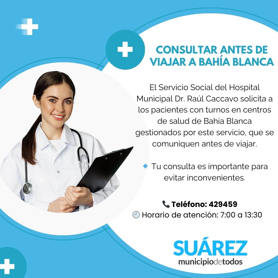 El Servicio Social del Hospital Municipal Dr. Raúl Caccavo solicita a los pacientes con turnos en centros de salud de Bahía Blanca gestionados por este servicio, que se comuniquen antes de viajar.