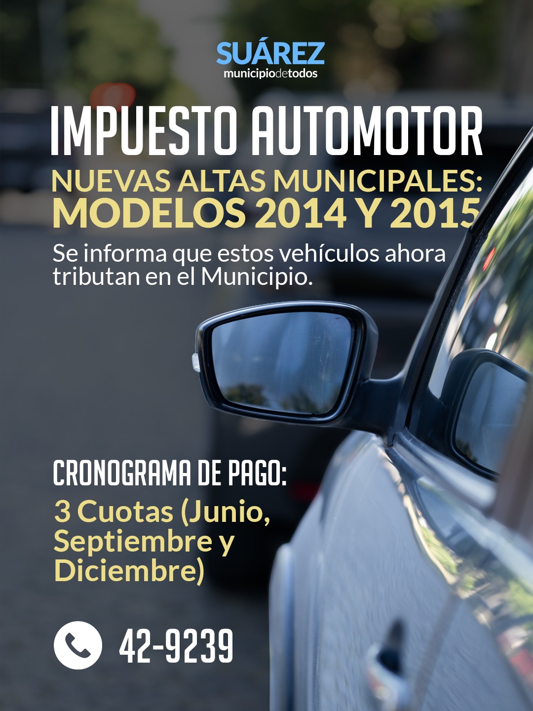 La Oficina de Automotores de la Municipalidad de Coronel Suárez informa que, en el marco de la Ley Impositiva Provincial N° 15.558 (año 2026), la Provincia de Buenos Aires transfirió a los municipios la administración y el cobro del Impuesto a los Automotores correspondiente a los vehículos modelo año 2014 y 2015.