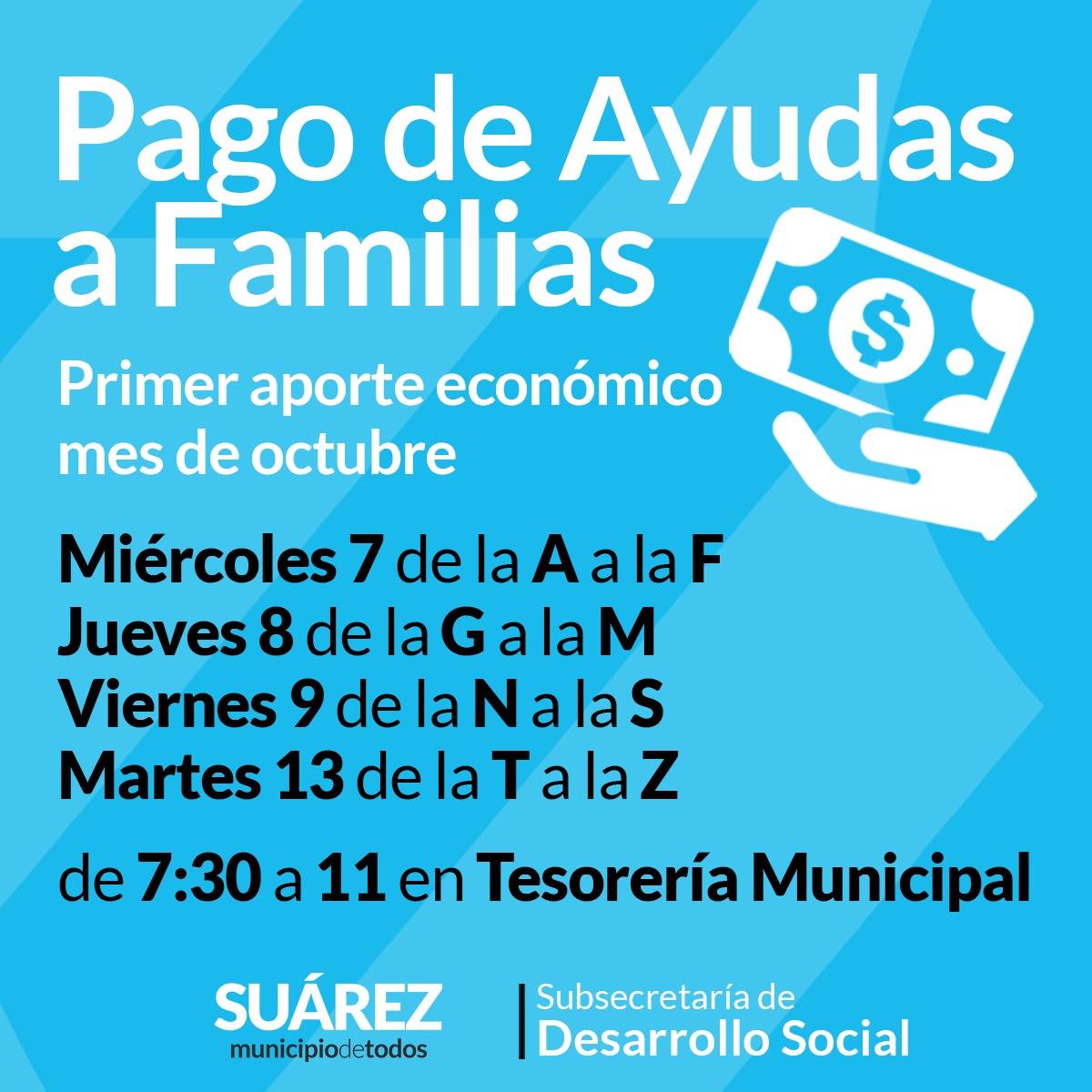 La subsecretaría de Desarrollo Social informa a aquellas vecinas y vecinos que reciben AYUDAS ECONÓMICAS que cobrarán el aporte del mes de octubre con el siguiente cronograma:⠀