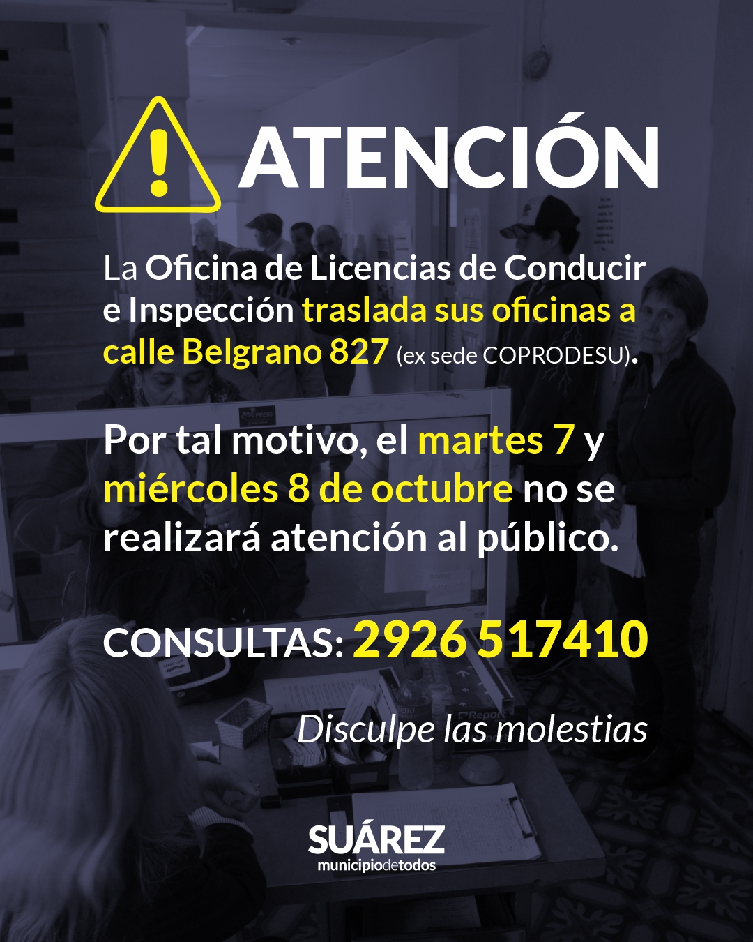 La Jefatura de Gabinete informa que la Oficina de Licencias de Conducir e Inspección traslada sus oficinas a calle Belgrano 827 (ex sede COPRODESU).