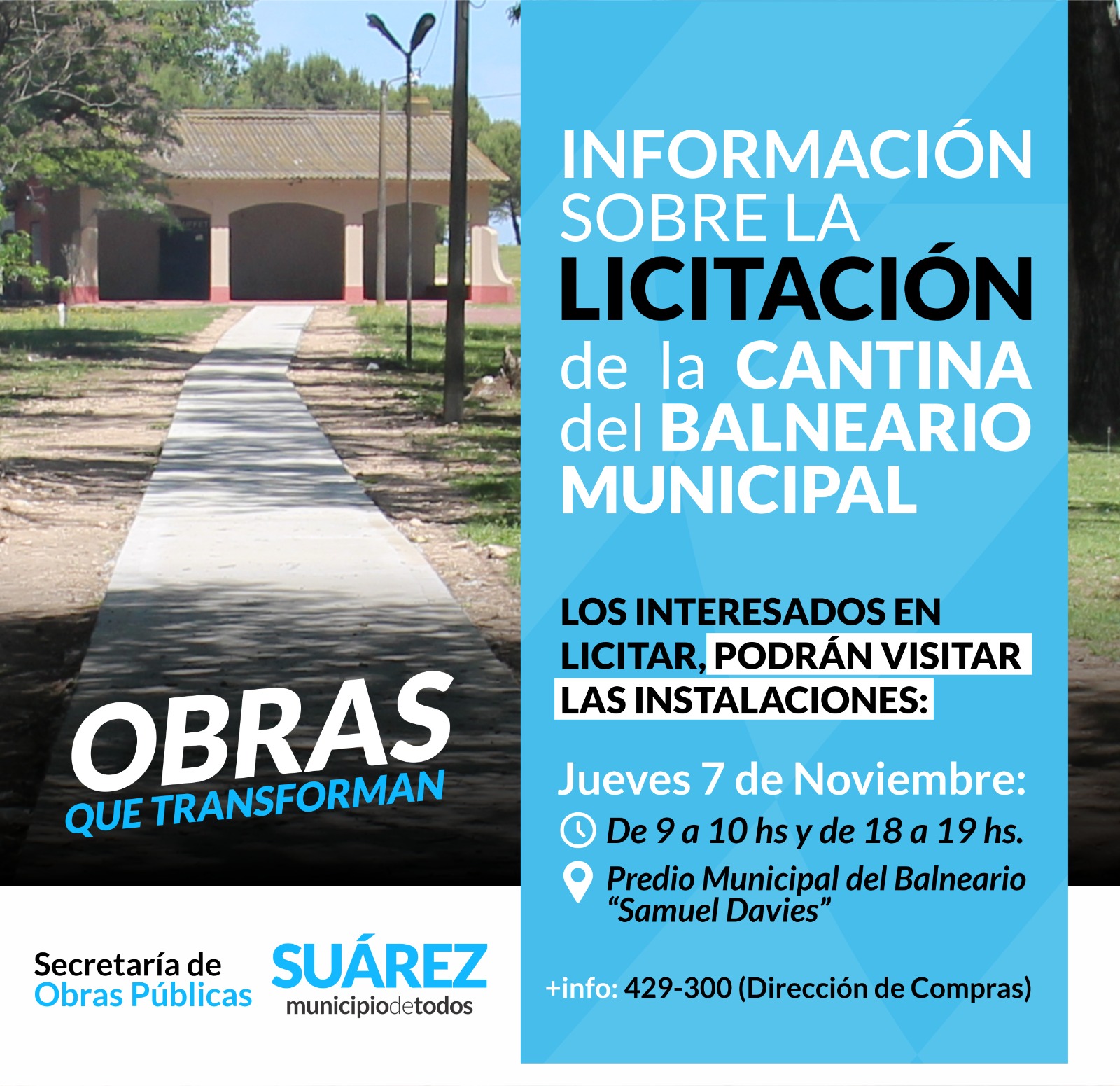 La Secretaría de Gobierno y Seguridad informa a los interesados en licitar el pliego de la Cantina del Balneario Municipal y deseen realizar una visita a las instalaciones, podrán hacerlo el jueves 7 de noviembre en los siguientes horarios: