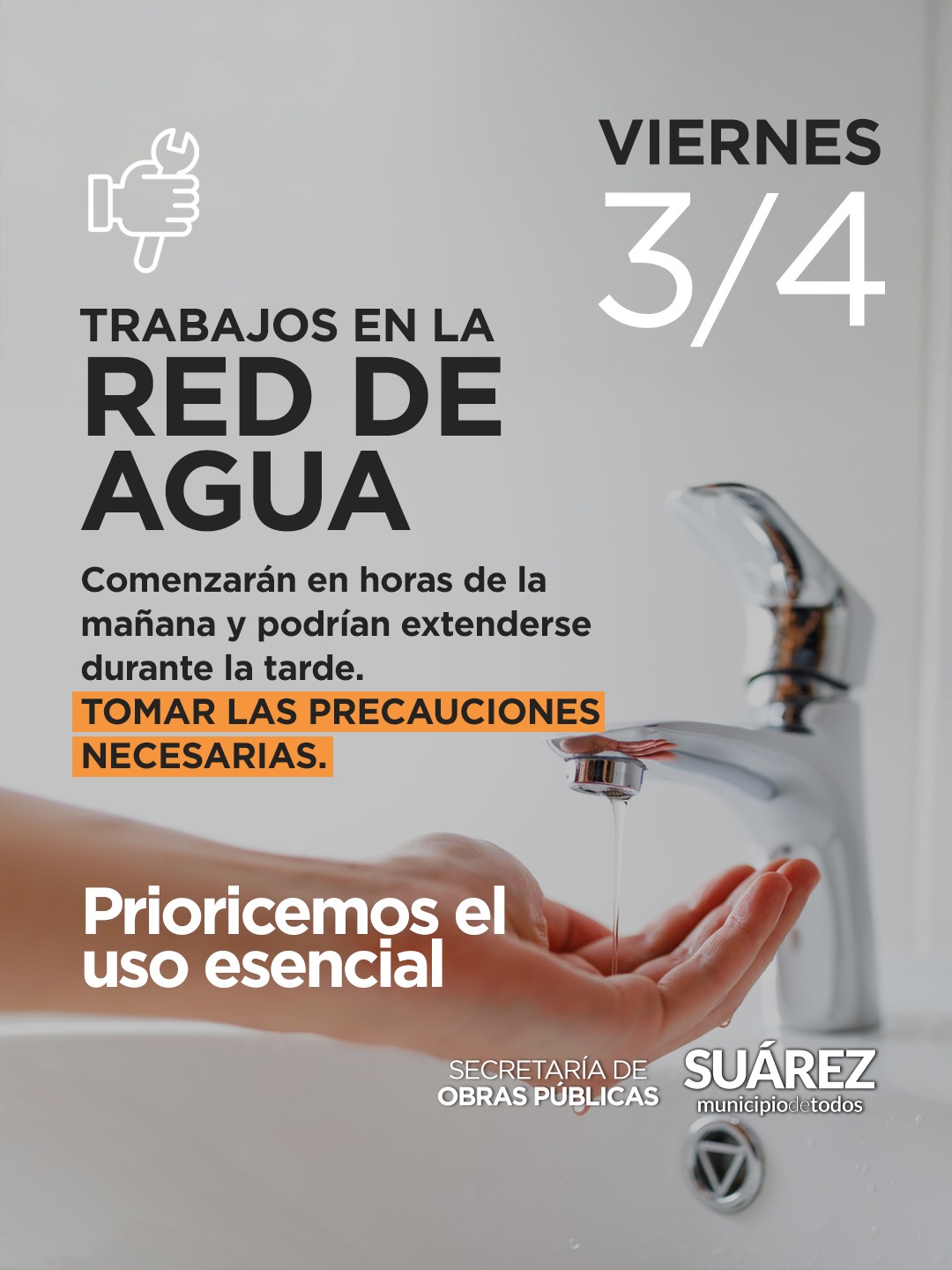 La Secretaría de Obras Públicas informa que este VIERNES 3 de abril se realizarán tareas de mantenimiento y optimización en el sistema de agua potable, en un sector de la red ubicado sobre calle Las Heras al 1100.