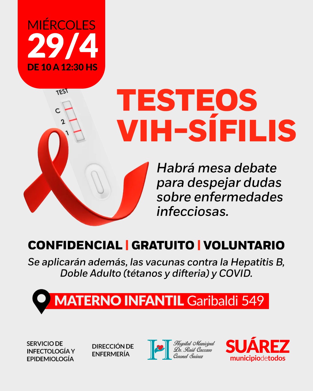El miércoles 29 de abril, de 10:00 a 12:30 hs, se realizarán testeos de VIH y sífilis en el Materno Infantil (Garibaldi 549).