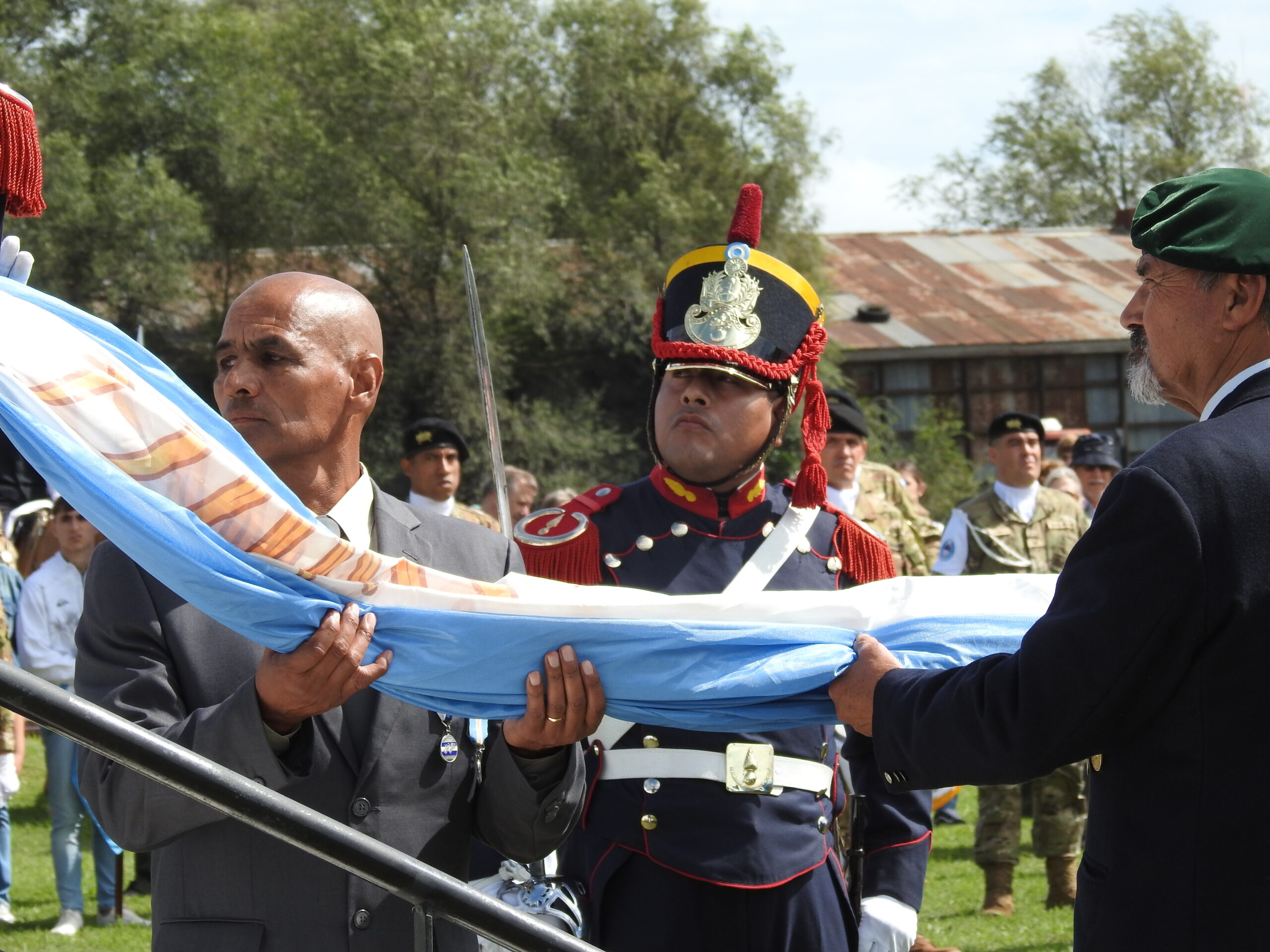Establecidos frente al mástil, los Veteranos entregaron la bandera a los Granaderos quienes fueron los encargados de izarla, para dar luego paso a las estrofas del Himno Nacional Argentino.