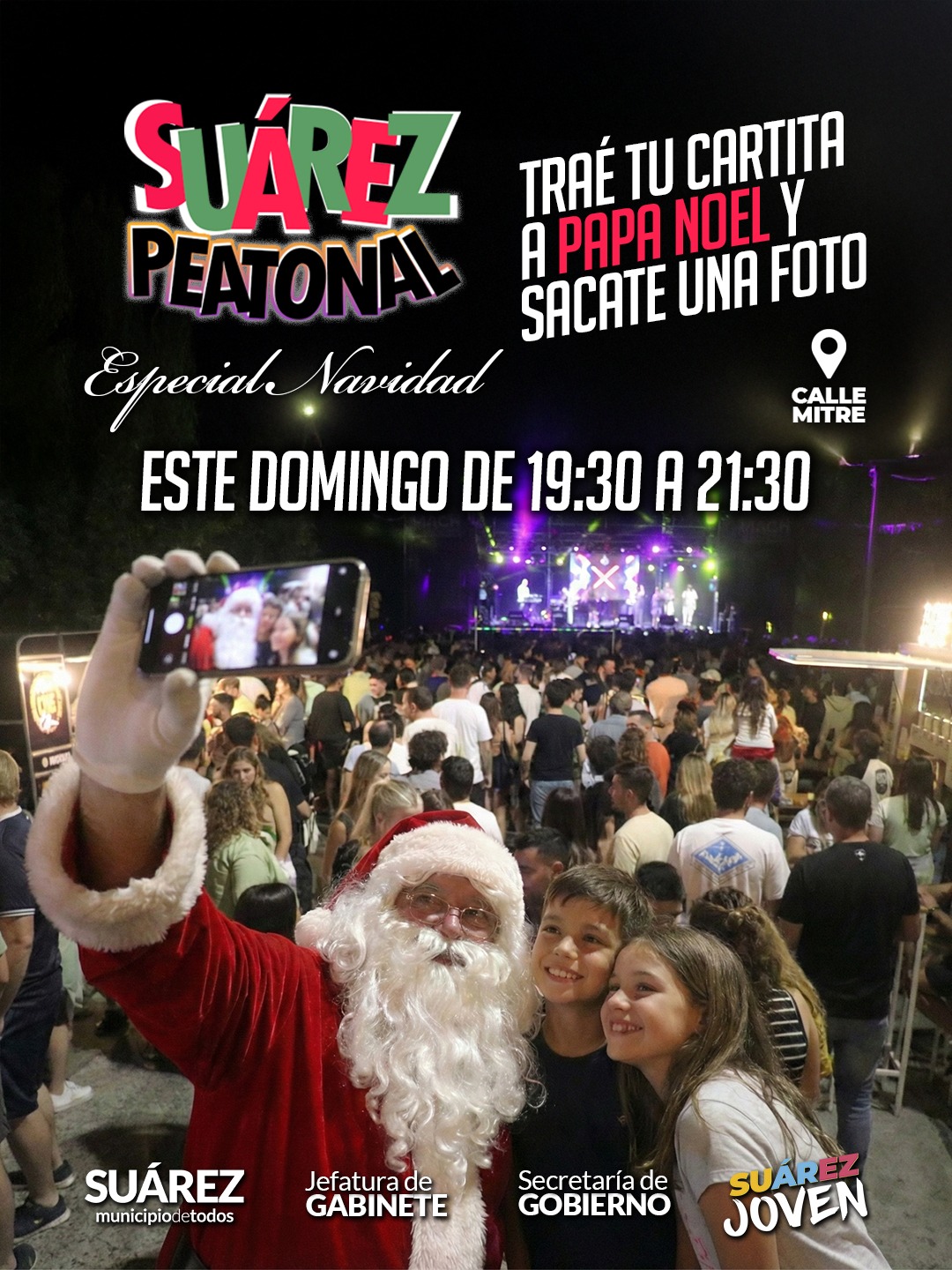 Papá Noel será parte de la 16° edición de Suárez Peatonal y espera a los más chicos junto a sus familias para vivir un momento pleno de ilusión. Vení a acercarle tu cartita para esta Nochebuena y sacate una foto que quedará para siempre en el recuerdo.