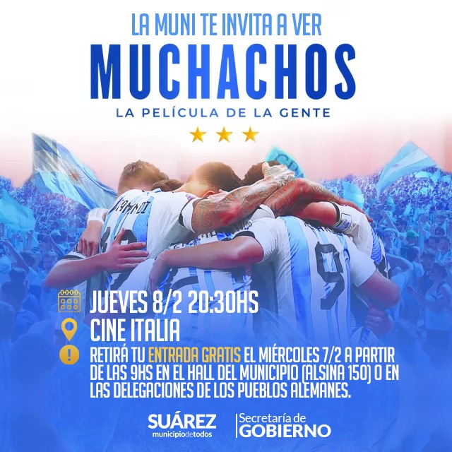 Revivamos esos momentos que nos devolvieron el “orgullo” de ser argentinos; los gritos de gol, la adrenalina de los penales y la experiencia de la selección Argentina que nos regaló la Copa Mundial de Fútbol 2022. La Muni te invita al cine, buscá tu entrada el MIERCOLES 7 a partir de las 9 de la mañana por Alsina 150. También se podrán retirar en cada una de las Delegaciones de los Pueblos Alemanes. Entradas limitadas