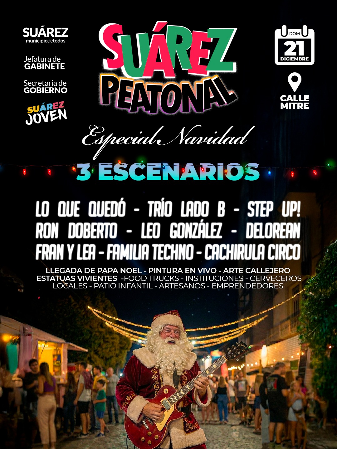 Este domingo 21 de diciembre desde las 18 horas, Suárez Peatonal llega en una edición especial Navidad sobre la tradicional calle Mitre, con tres escenarios y una programación artística para toda la familia, incluyendo la presencia de Papá Noel y un espacio especial pensado para los más chicos.