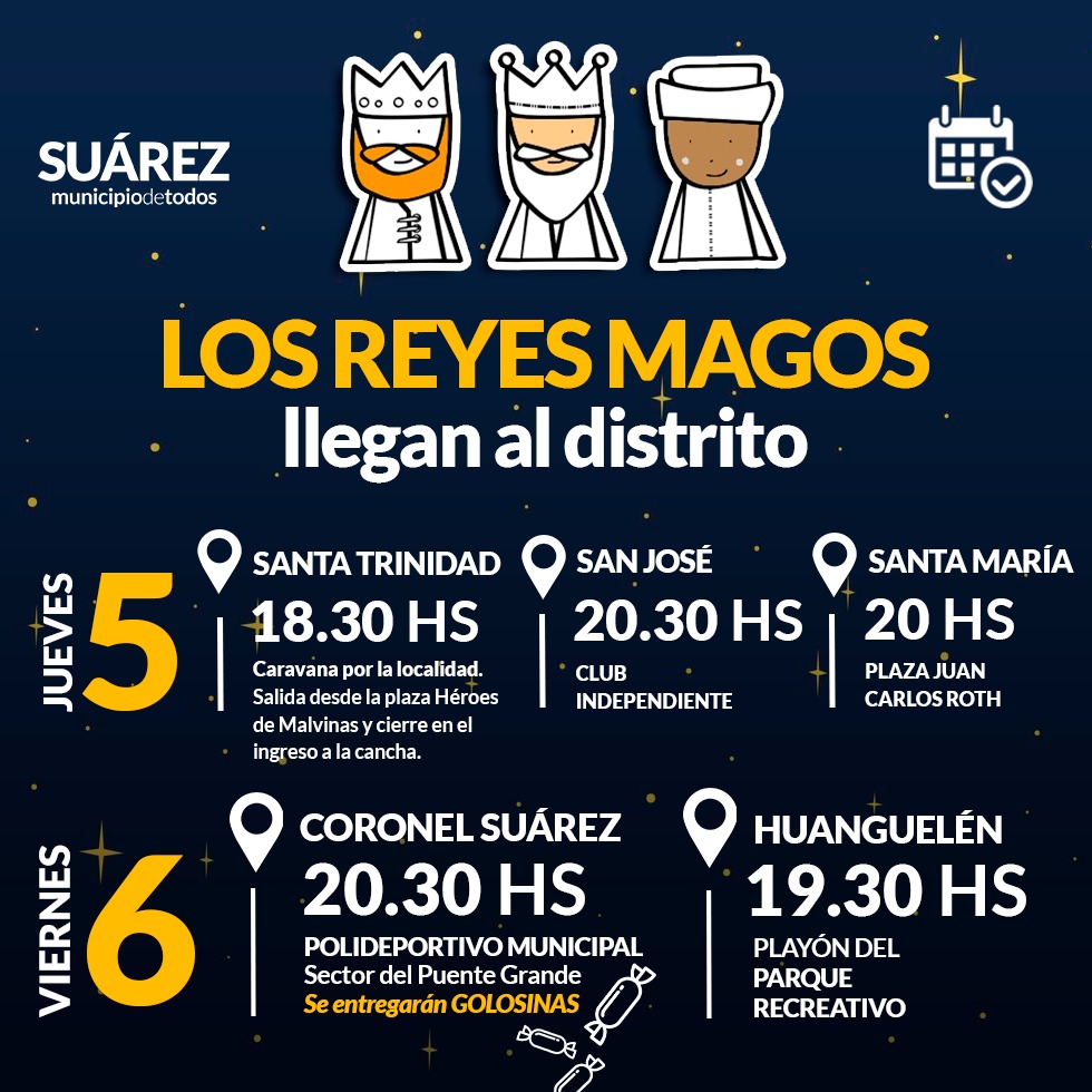De igual modo, en Coronel Suárez, la tradicional bajada de Reyes se realizará el 6 de enero, en el sector del Puente Grande-Polideportivo a partir de las 20, 30 horas, con música y alegría, esperando a los magos de oriente que entregarán golosinas.