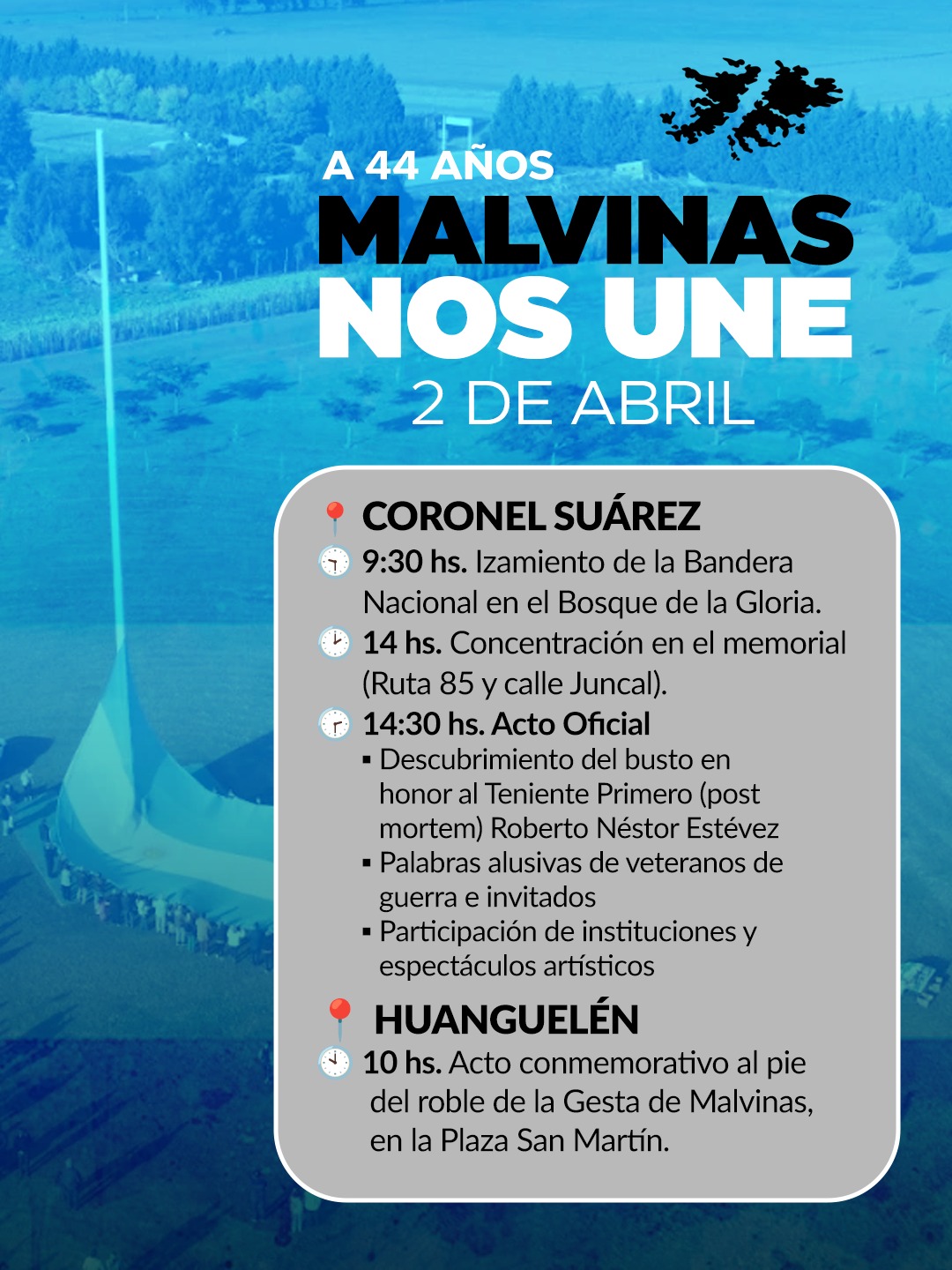 Este 2 de abril, en el marco del 44° aniversario de la Gesta de Malvinas, se invita a los vecinos a ser parte de los actos conmemorativos que se desarrollarán tanto en Huanguelén como en la ciudad cabecera, en homenaje a quienes defendieron la patria con valentía y entrega, en una jornada cargada de emoción y memoria.