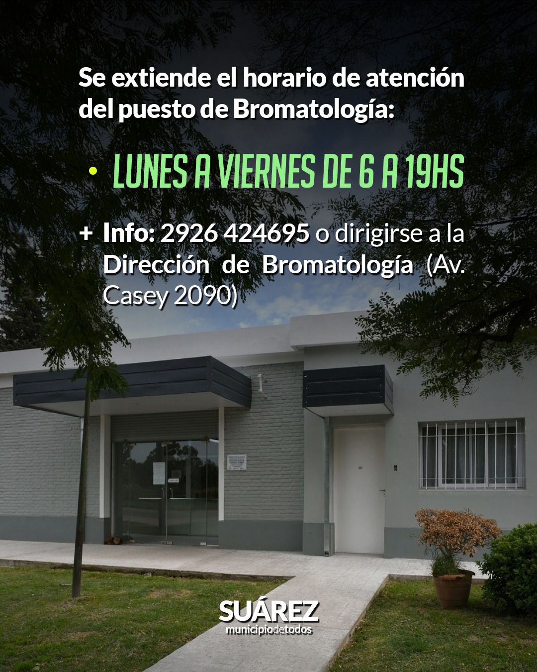 Con el objetivo de asegurar la elaboración, distribución y expendio de alimentos inocuos en nuestra ciudad, la Secretaría de Salud de la Municipalidad de Coronel Suarez, a través de la Dirección de Bromatología, comunica que se extiende el horario de atención de lunes a viernes de 6:00hs a 19:00hs.