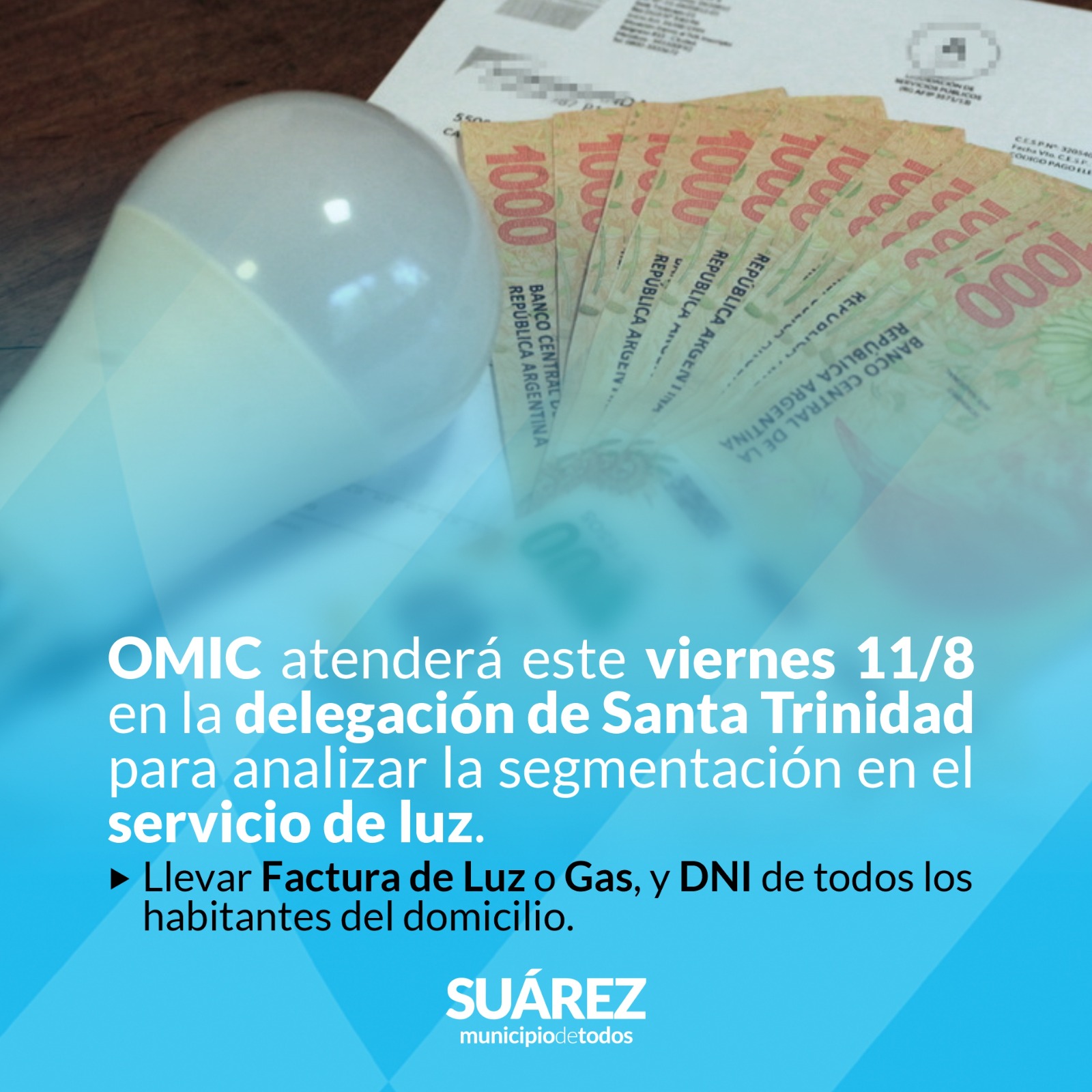 La Oficina Municipal de Información al Consumidor, informa a los vecinos de Pueblo Santa Trinidad, que atenderá este VIERNES, de 8 a 12 para analizar la segmentación en el servicio de luz y gas