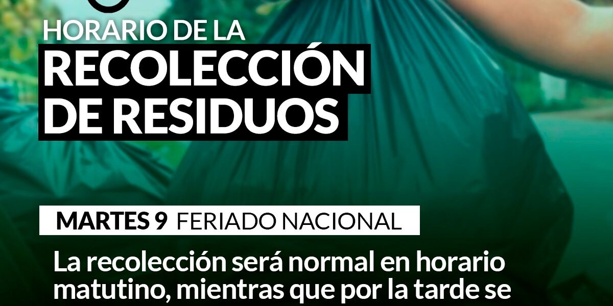 La secretaría de Servicios Públicos informa a la población que mañana MARTES 9 DE JULIO, Feriado Nacional por ser el DÍA DE LA INDEPENDENCIA; la recolección de residuos será normal en horario matutino, mientras que por la tarde se realizará a partir de las 16.