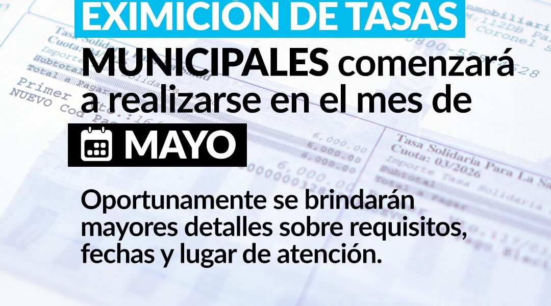 La subsecretaría de Desarrollo Social informa a la comunidad que el trámite de EXIMICIÓN DE TASAS municipales comenzará a realizarse en el mes de MAYO. Oportunamente se brindarán mayores detalles sobre requisitos, fechas y lugar de atención.