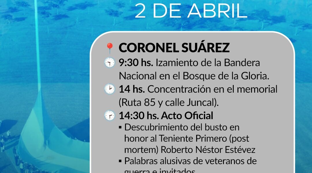 Este 2 de abril, en el marco del 44° aniversario de la Gesta de Malvinas, se invita a los vecinos a ser parte de los actos conmemorativos que se desarrollarán tanto en Huanguelén como en la ciudad cabecera, en homenaje a quienes defendieron la patria con valentía y entrega, en una jornada cargada de emoción y memoria. 📍 Coronel Suárez