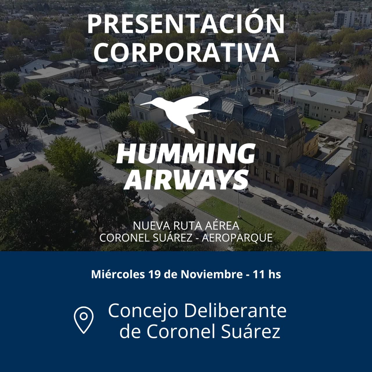 El Intendente Municipal Ricardo Moccero y Francisco Simón Errecart, titular de Humming Airways S.A., tienen el agrado de invitar a Usted al encuentro donde se presentará la propuesta para operar servicios aéreos regulares de Coronel Suárez a la ciudad de Buenos Aires.