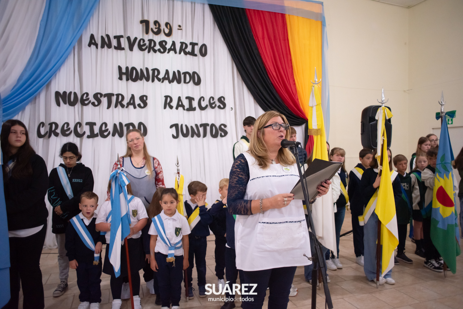 Durante el acto también compartió su mensaje la directora de la Escuela Secundaria Parroquial, Gabriela Werbag, poniendo en valor el rol de la educación en el presente y futuro del pueblo.