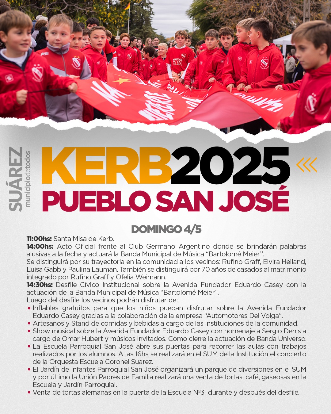 El Intendente Municipal Ricardo Moccero junto al delegado de Pueblo San José Daniel Schwindt y las instituciones de la segunda colonia alemana invitan a los vecinos y vecinas del distrito a participar durante todo el mes de mayo, del programa de actividades por una nueva Fiesta de Kerb.