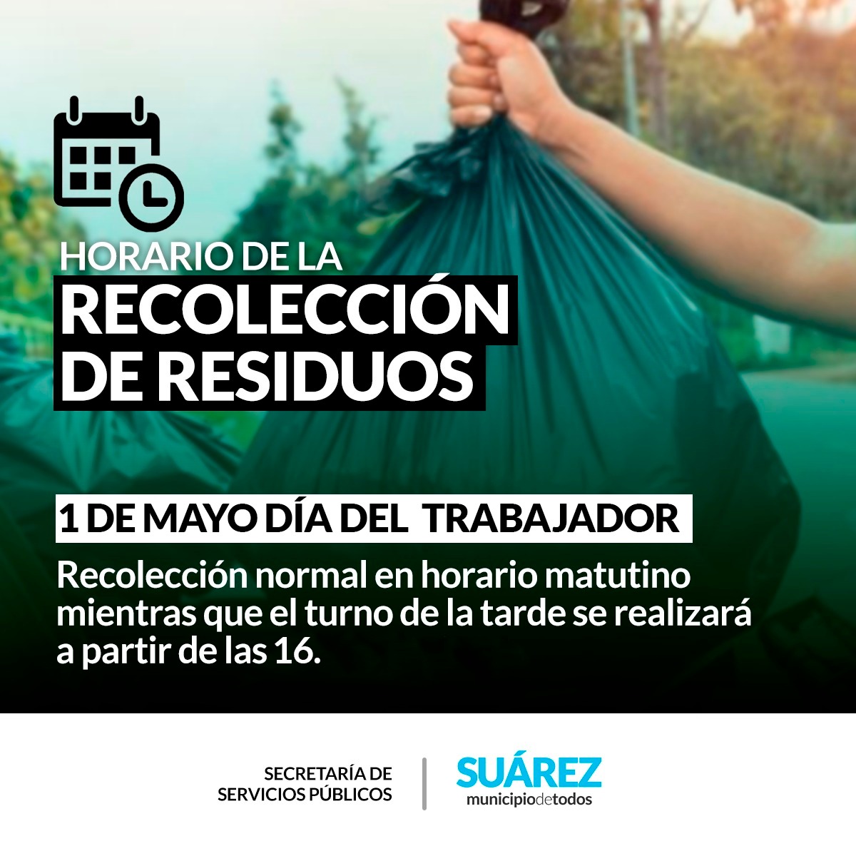 La secretaría de Servicios Públicos informa a la población que mañana MIÉRCOLES 1 DE MAYO, Feriado Nacional por ser el DÍA DEL TRABAJADOR; la recolección de residuos será normal en horario matutino, mientras que por la tarde se realizará a partir de las 16.
