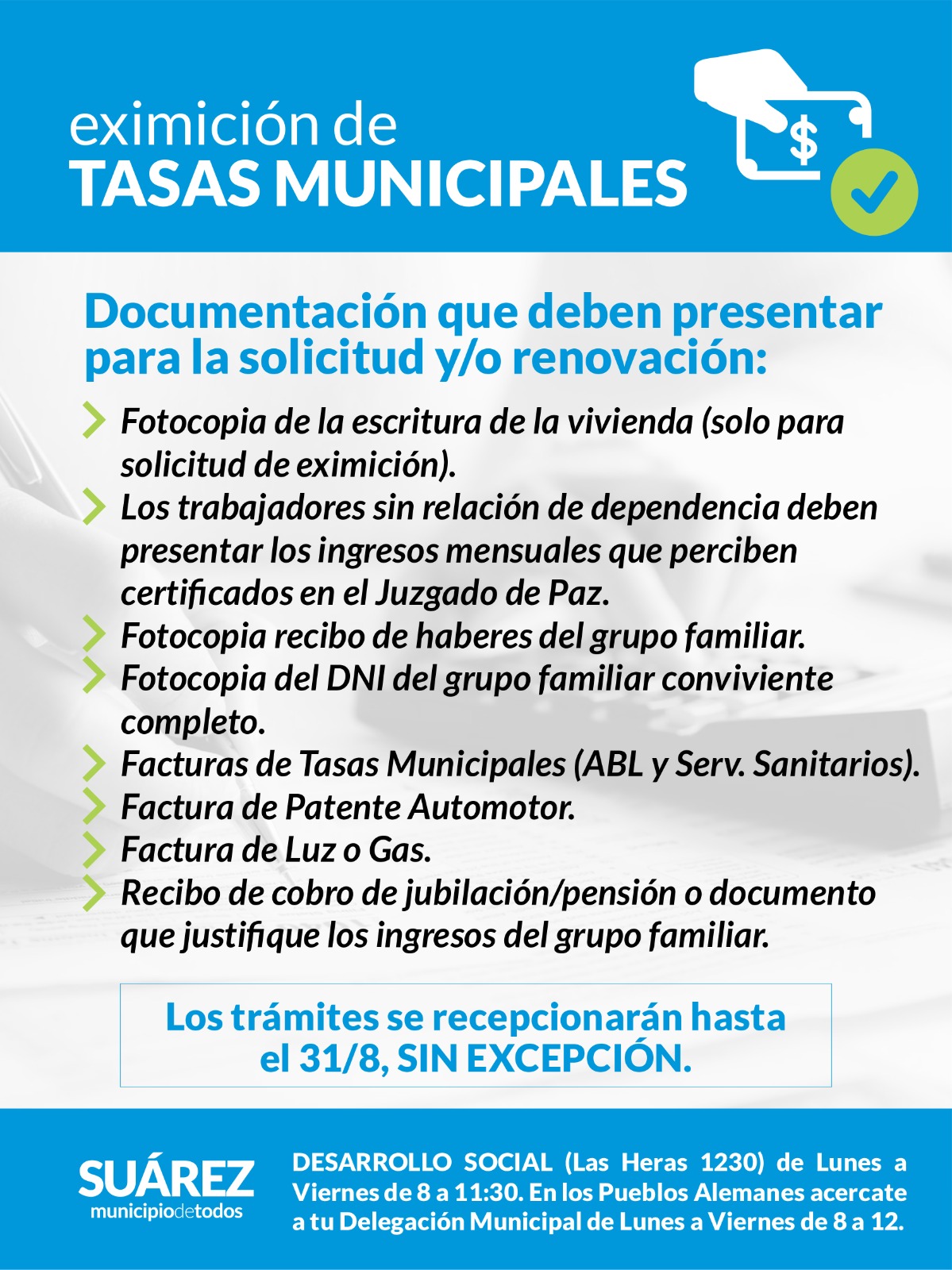 La subsecretaría de Desarrollo Social solicita a todos los vecinos y vecinas que necesiten tramitar la Renovación y /o Eximición de Tasas Municipales para el año 2027 acercarse, con la documentación correspondiente, a las oficinas de Las Heras 1230, de lunes a viernes de 8:00 a 11:30hs.