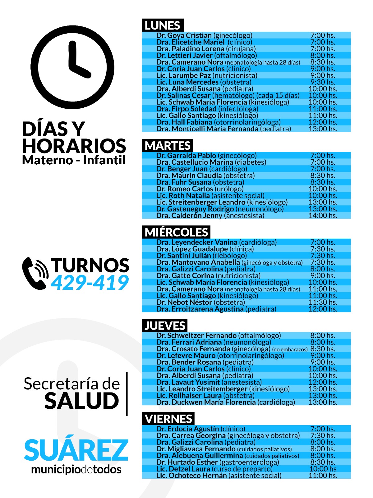 • Pediatra: Miércoles 08:30  hs. y Viernes 10:00 hs.