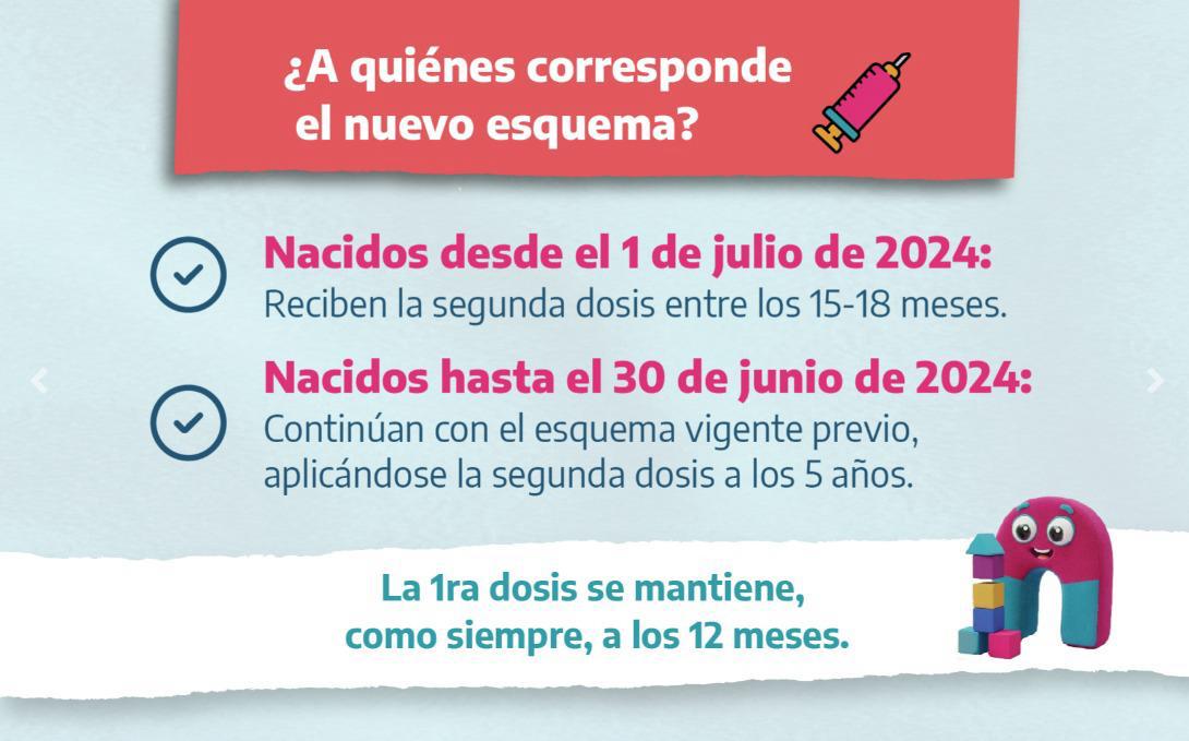 Los nacidos hasta el 30 de junio de 2024 continúan con el esquema vigente, aplicando la segunda dosis a los 5 años.