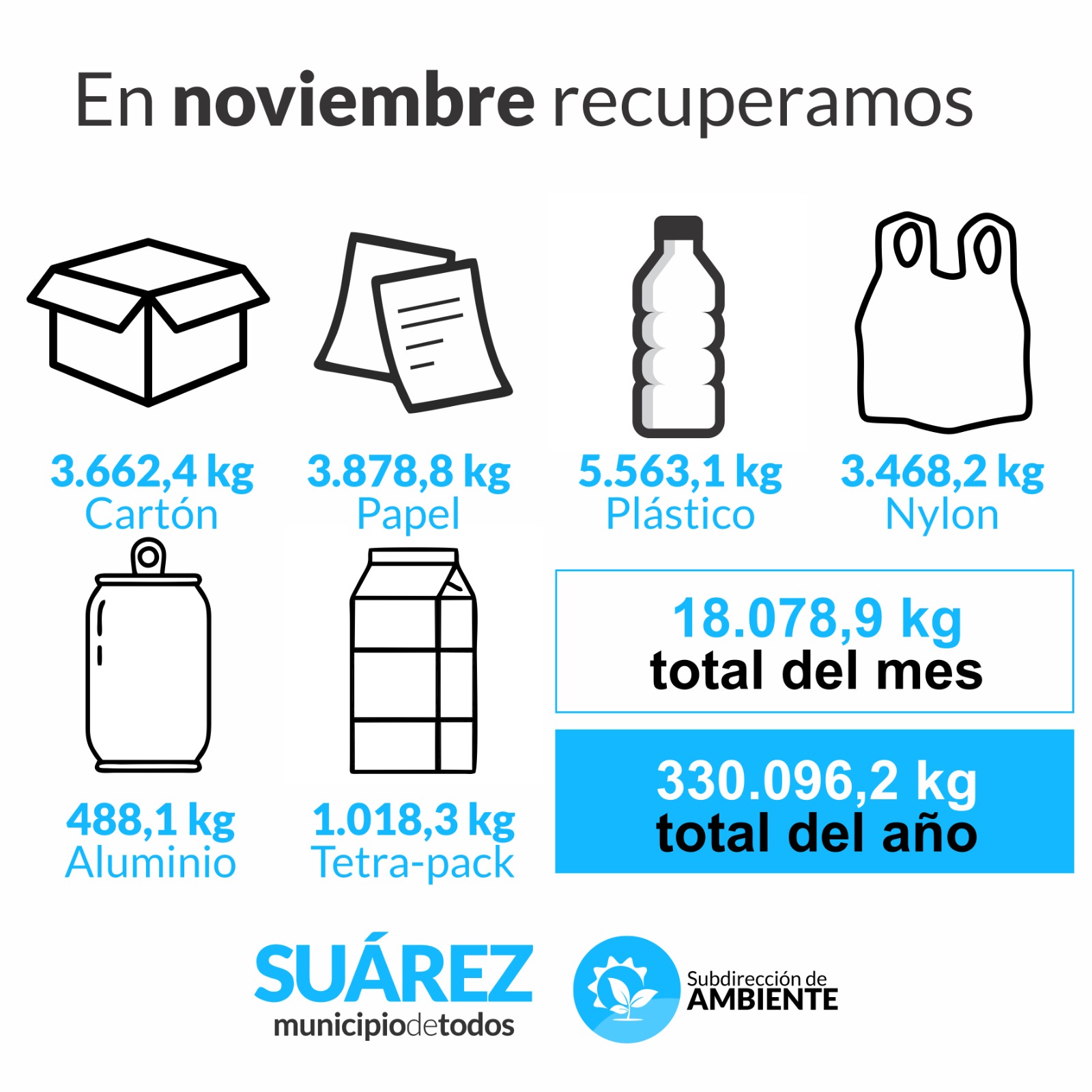 La subdirección de Ambiente informa que durante el mes de NOVIEMBRE se vendieron 18.078,9 kg. de material recuperado en la Planta de Separación y Tratamiento de Coronel Suárez, llevando en lo que va del año 330.096,2 kg.