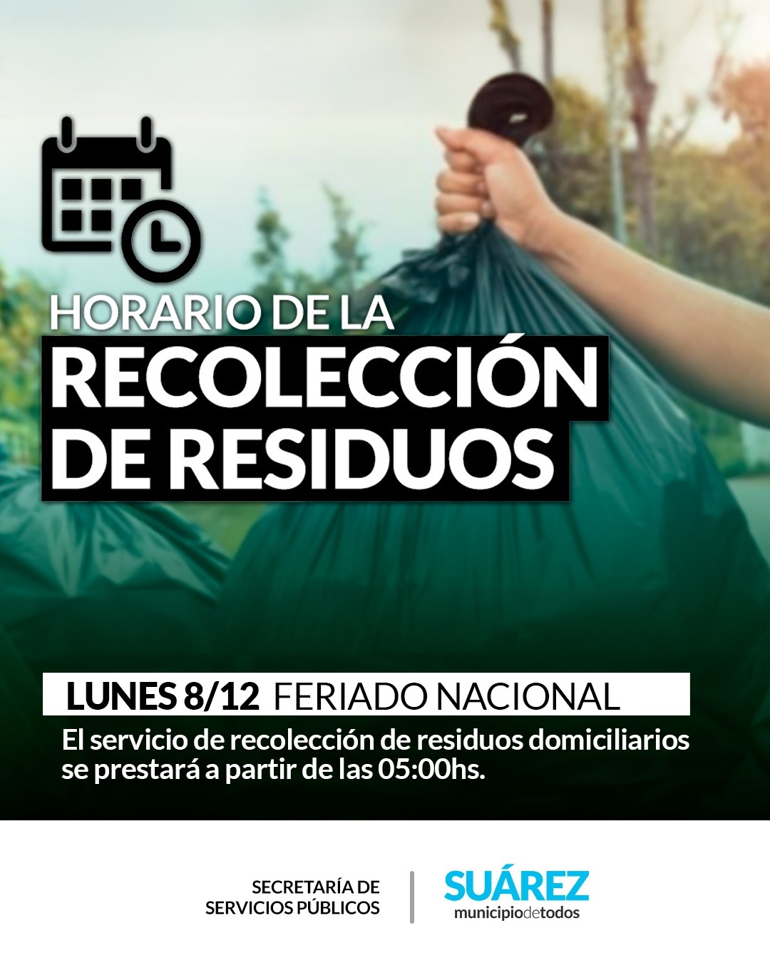 La secretaria de Servicios Públicos informa a la comunidad que este lunes 8 de diciembre –Feriado Nacional por el Día de la Inmaculada Concepción de María- el servicio de recolección de residuos domiciliarios se prestará a partir de las 05:00hs..