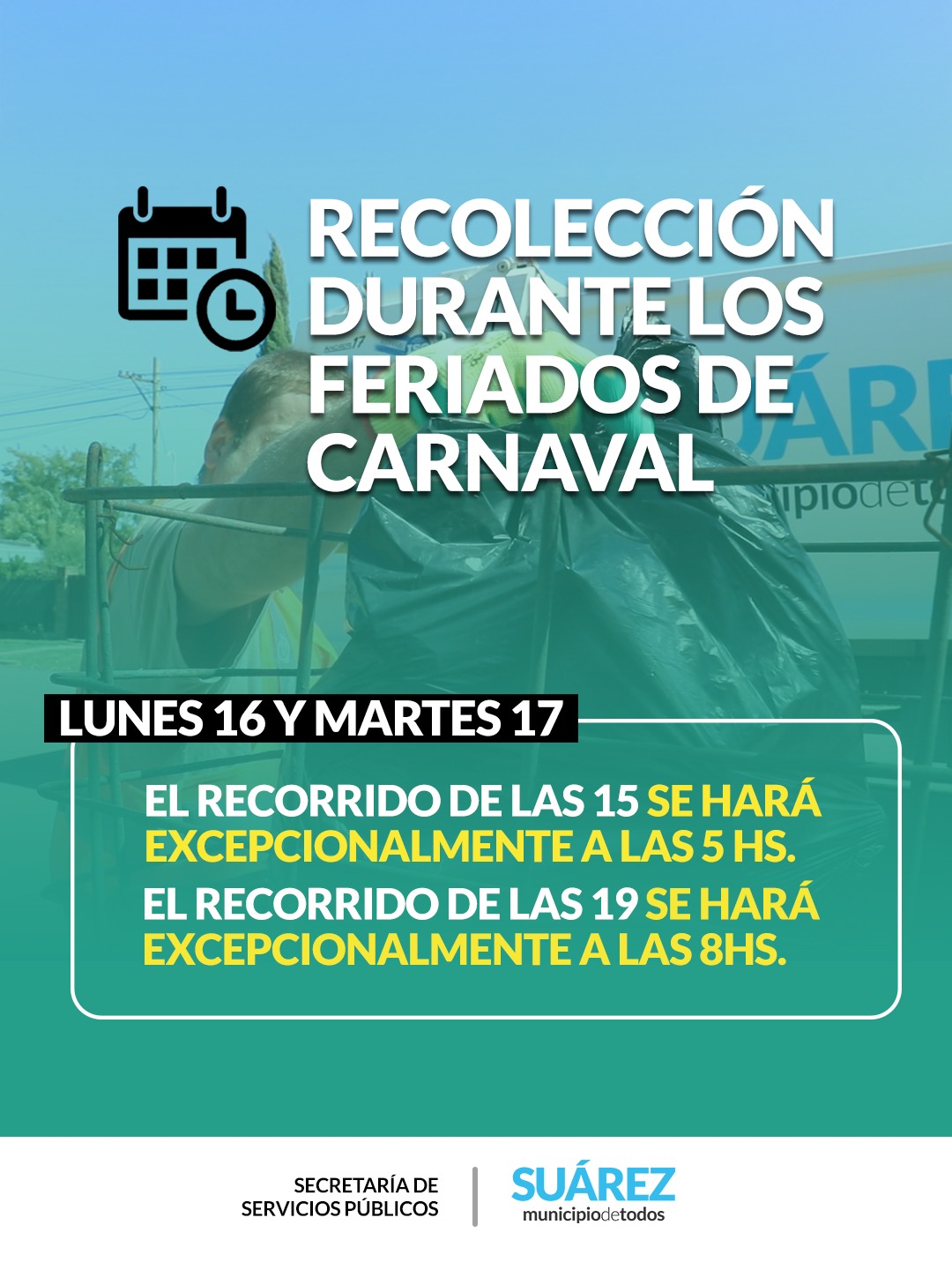 La secretaria de Servicios Públicos informa a la comunidad que los días lunes y martes –Feriado de Carnaval- el Servicio de recolección de residuos domiciliarios se prestará de la siguiente manera: