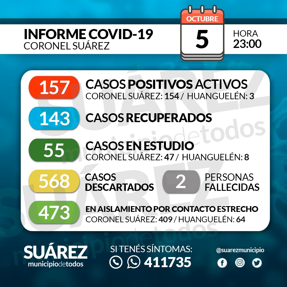 ☑ CASOS POSITIVOS ACTIVOS: 157 Coronel Suárez: 154 / Huanguelén: 3