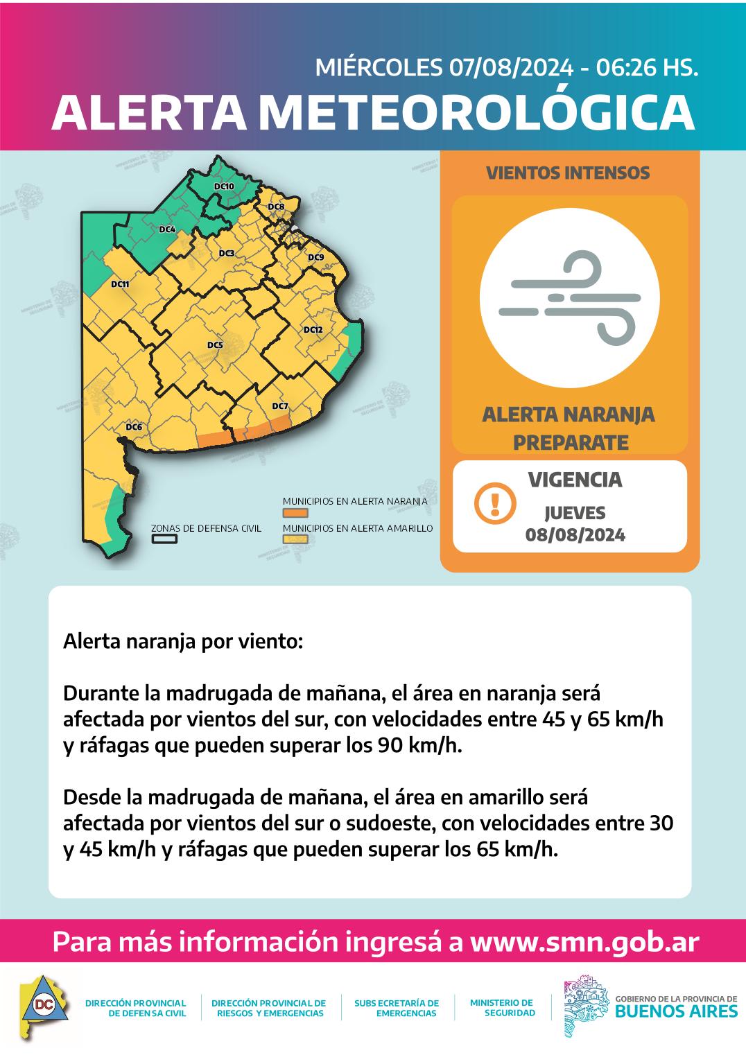 Ventoso del sudoeste con ráfagas que pueden alcanzar los 50 km/h, cambiando desde el mediodía a vientos del sur con ráfagas de entre 60 y 70 km/h, pudiendo ser mayores en municipios costeros y sierras. Lluvias y lloviznas durante gran parte del día, con mayor intensidad desde la tarde. Se prevén acumulados de 15 a 25 mm para municipios del oeste de la zona, mientras que en municipios costeros y del este de la zona, se pueden alcanzar valores de entre 30 y 60 mm, pudiendo ser mayores de forma puntual.