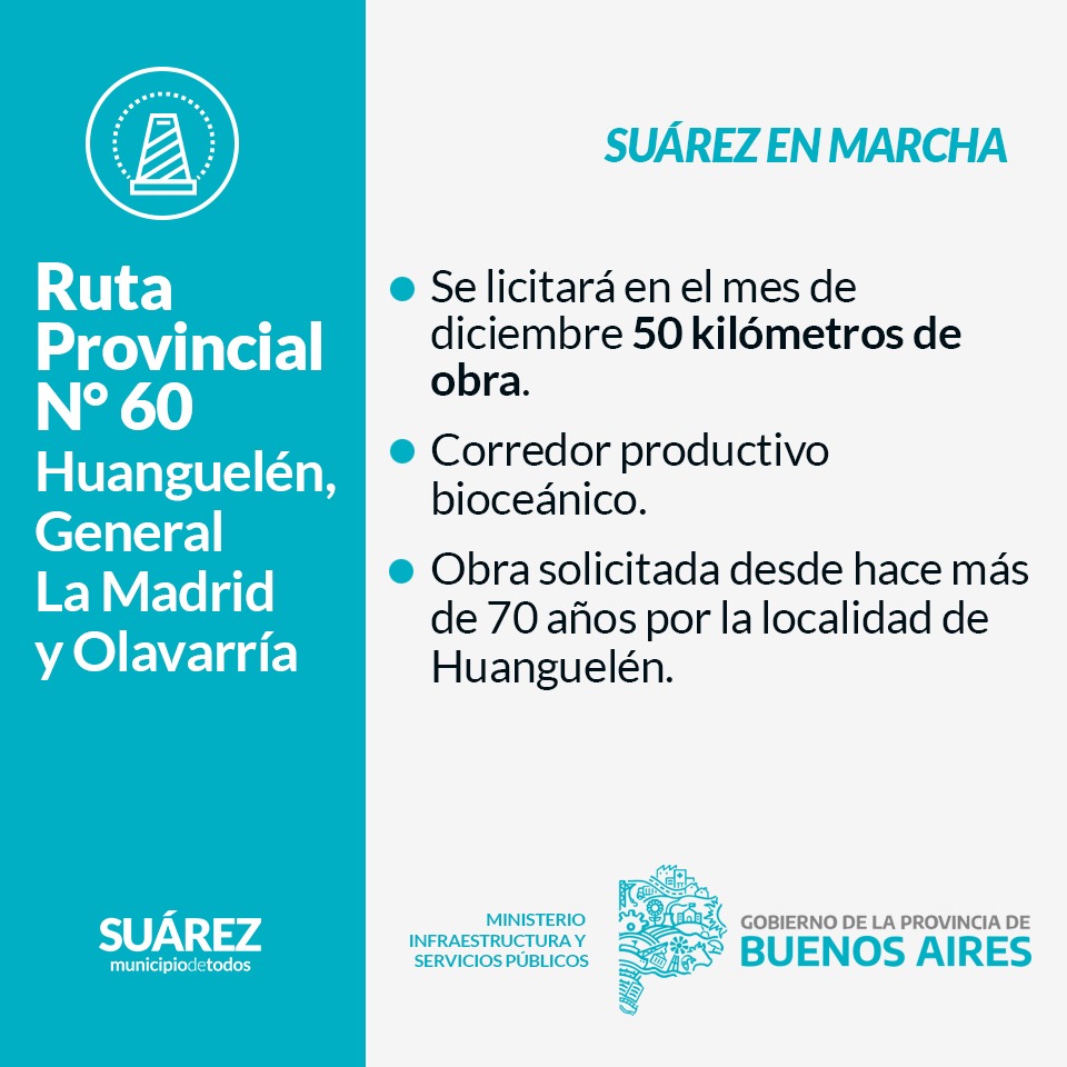 ???En el mes de diciembre se licitarán 50 kilómetros de obra. También confirmó la licitación para la repavimentación de la Ruta Provincial N° 85 en el tramo desde la rotonda de Huanguelén a Guaminí, el tramo de la Ruta N° 76 hasta el cruce con la Ruta N° 72 a Sierra de la Ventana y el camino Estación Primavera.